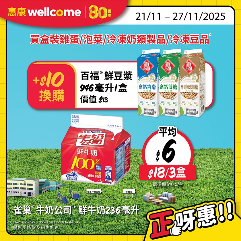 ,唔好錯過多款超值產品!今期惠康有百福®鮮豆漿、雀巢®牛奶公司™鮮牛奶、四海魚麵/魚皮餃/魚肉春卷及卡樂B薯片,快啲嚟入貨啦
