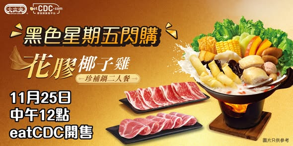 最啱就係食番個花膠椰子雞珍補鍋暖身!大家樂eatCDC推出黑色星期五快閃優惠,除咗有$98起嘅超抵二人餐券外,仲有豐富堅料任你揀~ 買2套指定火鍋餐券,仲送多碟肉同豬肉丸加料!11月25日中午12點開售!到時記得上eatCDC搶購喇~