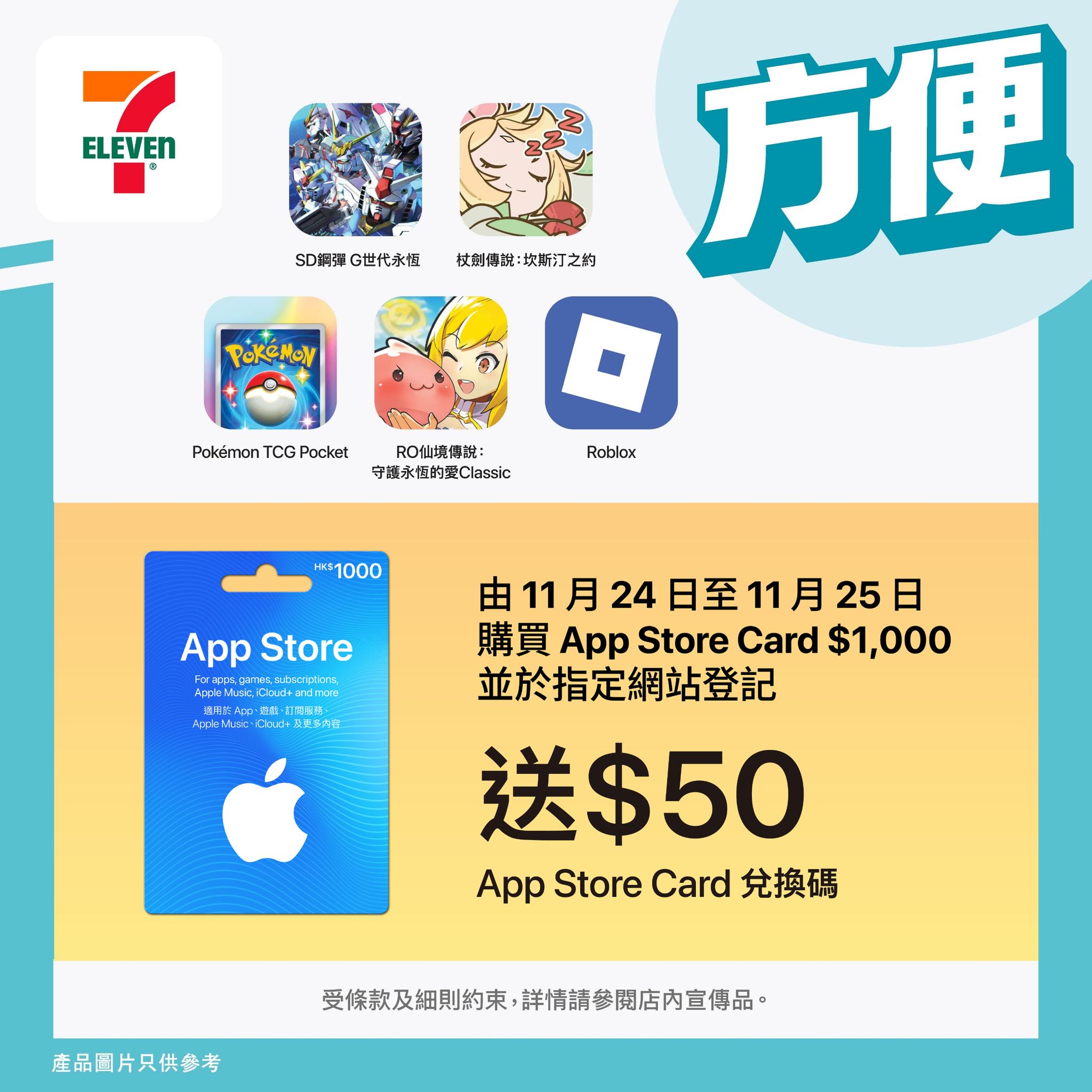 於11月24日至 25日推廣期內購買 App Store Card $1,000 ,並於 2025 年 12月2日*前到網站 https://getbonuscode.com/HK1125SE 完成登記,即可獲贈 App Store Card $50兌換碼!!