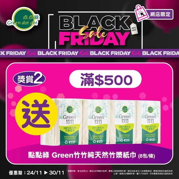 滿$500送 点点綠Green竹竹純天然竹漿紙巾 (8包/條) 1件 (價值$15)