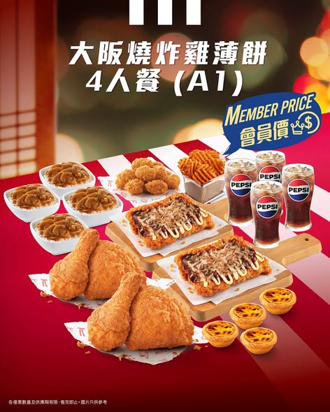 -「大阪燒炸雞薄餅」於上午11時後於香港及澳門肯德基餐廳供應 (山東街、亞洲國際博覽館 、赤柱及又一城分店除外)