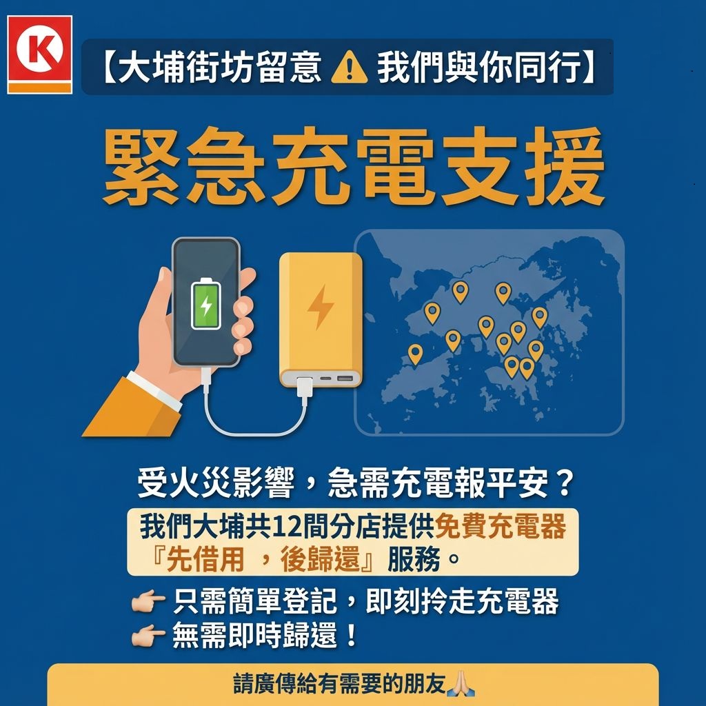 我們大埔共12間分店提供免費充電器「先借用,後歸還」服務。