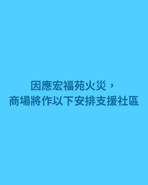 因應宏福苑火災,大埔超級城支援社區如下:1. D區開放時間延長24小時,以供有需要的市民休息。2. D區內提供樽裝水及蘇打餅乾。3. 提供免費行動電源租借服務。有需要的市民可致電2665 6828 臨時 24 小時社區支援熱線,商場將盡量協助。https://www.facebook.com/taipomegamall.fans