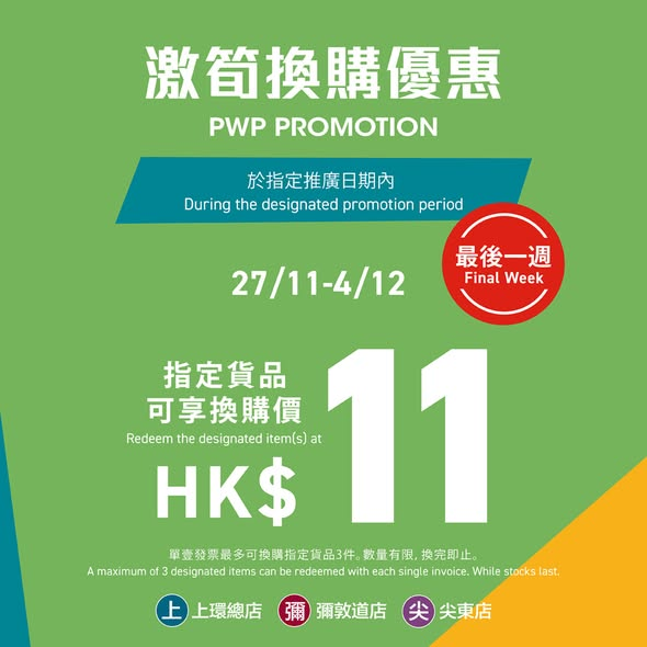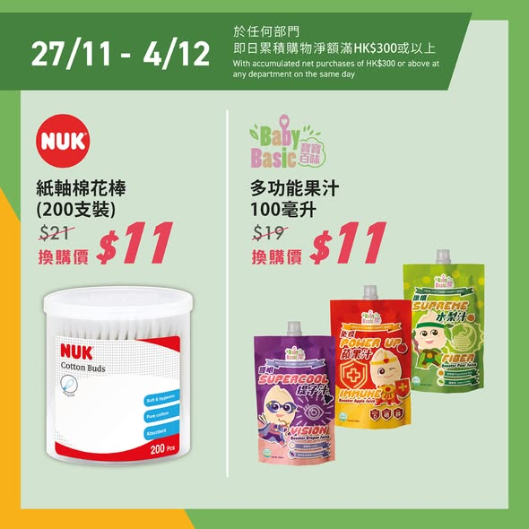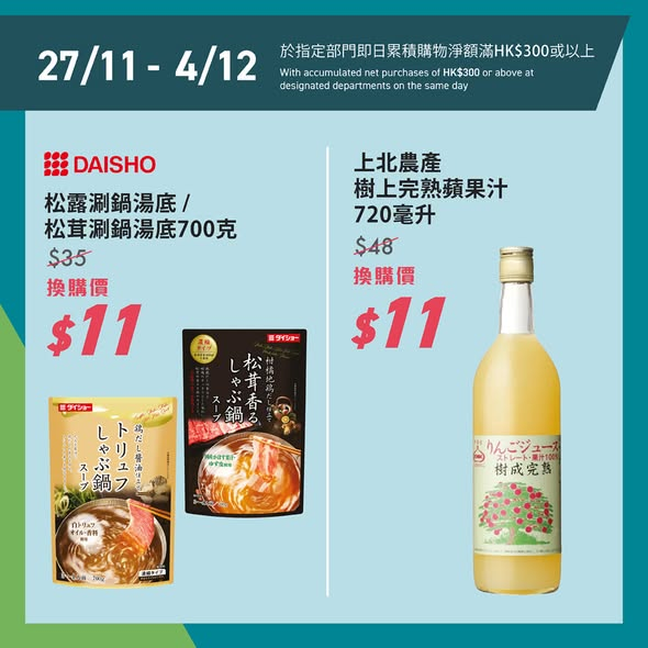 $11激筍換購優惠】即日起至2025年12月4日,凡於指定部門即日累積購物淨額滿$300或以上,即可以$11換購指定貨品