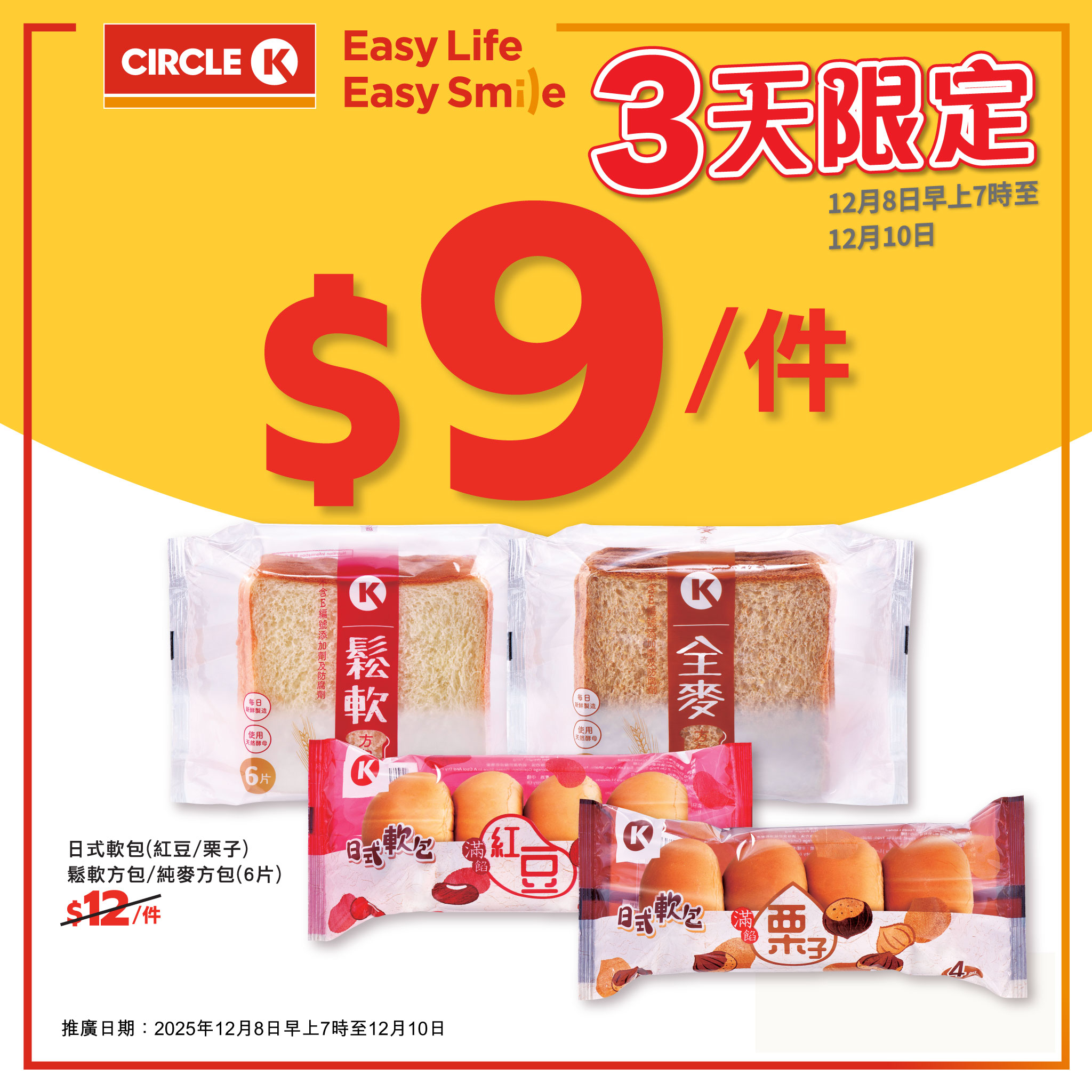【3日限定!】日式軟包/方包只需 $9!.OK便利店為你準備咗限時3日嘅麵包優惠,由 2025年12月8日早上7時 至 12月10日,無論係紅豆、栗子嘅日式軟包,定係鬆軟方包、純麥方包,依家都係只需 $9,就可以享受軟包同方包嘅美味喇!.快啲嚟Circle K揀返件,唔好錯過!.#OK便利店 #Circlek #限時優惠 #日式軟包 #方包 #純麥方包 #3日限定