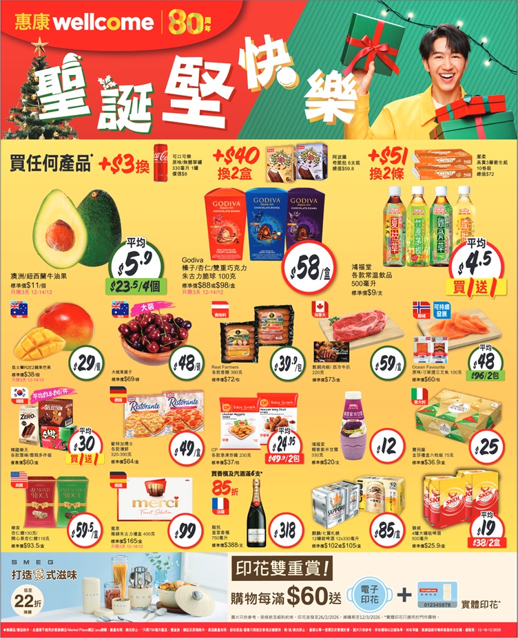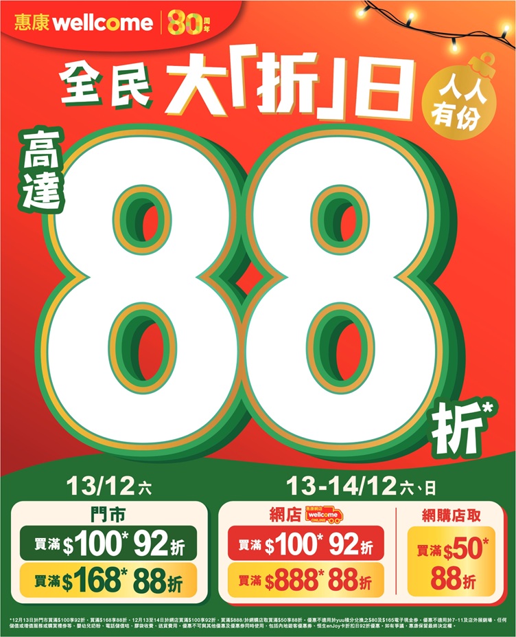 *12月13日於門市買滿$100享92折, 買滿$168享88折。12月13至14日於網店買滿$100享92折,買滿$888/於網購店取滿$50享88折。優惠不適用於yuu積分兑換之$80及$165電子現金券。優惠不適用於7-11及店外展銷場、任何儲值或增值服務或購買禮券等、嬰幼兒奶粉、電話儲值咭、膠袋收費、 送貨費用。優惠不可與其他優惠及優惠券同時使用,包括內地遊客優惠劵、恒生enJoy卡折扣日92折優惠。 如有爭議,惠康保留最終決定權。