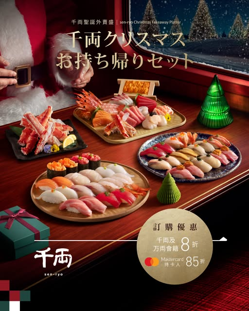 即日起至2026年1月1日,經到店外賣自取或網上訂購千両聖誕盛低至8折$148.8起,以高性價比細味鯛魚、鱈場蟹、海膽及魚子醬等上乘食材招待親朋好友。立即訂購將豐盛佳餚帶回家中,與親朋好友一同享用豐盛聖誕盛宴。