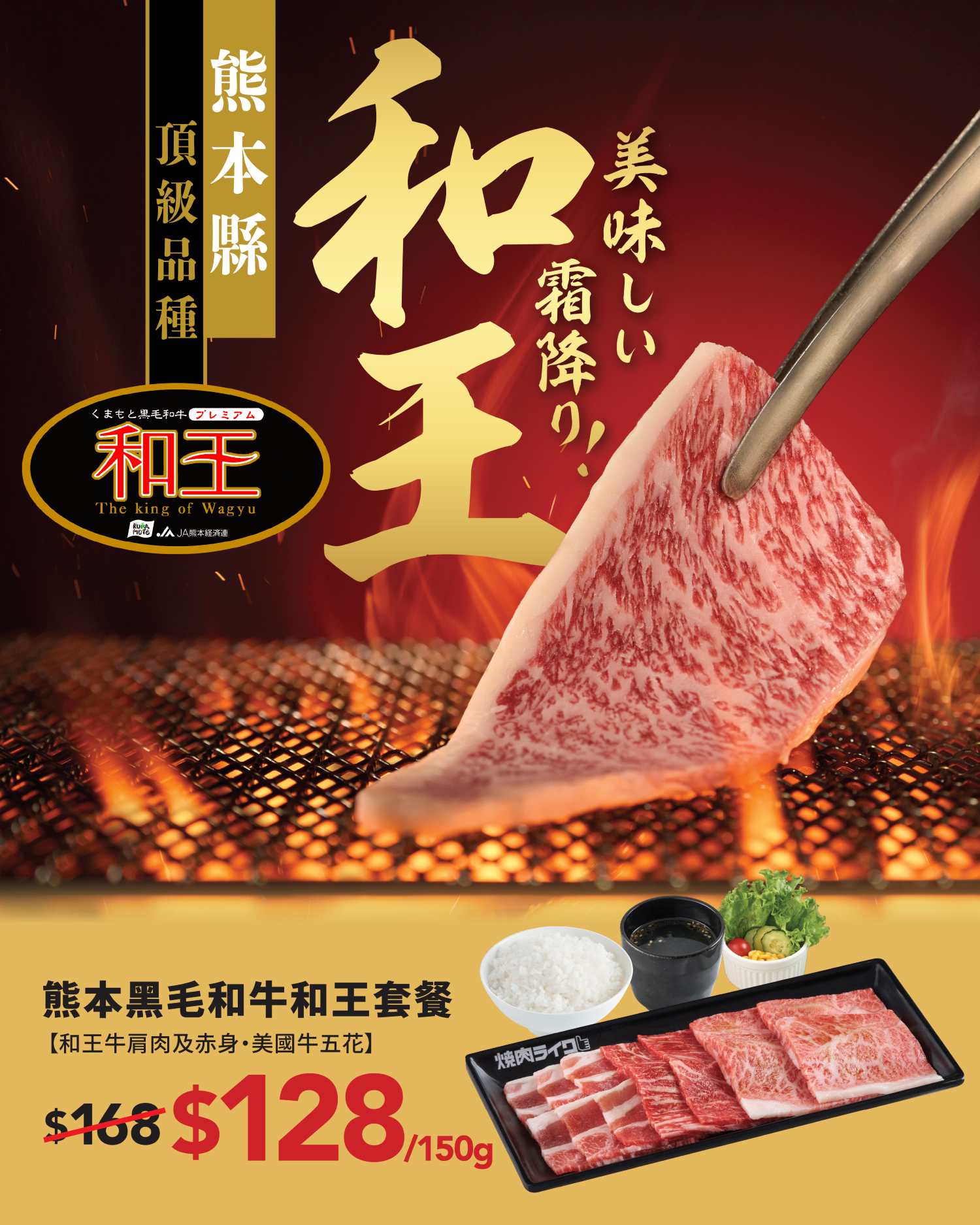 適逢五周年,「燒肉LIKE」特別引入日本熊本縣最高級別的黑毛和牛─「和王」!全新「熊本黑毛和牛和王套餐」嚴選熊本黑毛和牛中的極品,屬日本A4和牛,只有28個月以上、以精選飼料飼養、大理石花紋達到6級(滿分12級)以上的和牛,才能獲得「和王」的稱號!熊本黑毛和牛生長於擁有純淨水源及豐富天然資源的原始自然環境,加上生產者精湛的育飼技術,令每一片和牛肉都遍佈均勻細緻的油花,肉質細膩柔軟,且帶有獨特的香甜味道!套餐主打「和王」牛肩肉及赤身兩大部位:牛肩肉油花分佈均勻,肉質紮實中帶柔嫩;而赤身則肉味更濃郁,啖啖都是和牛最純粹的鮮甜肉香!再配上肥瘦相間、口感細嫩的美國牛五花,讓大家以超高CP值的價錢即可品嚐三重燒肉滋味,全方位滿足對燒肉的一切想像!推廣期內更可以優惠價$68/50g或$118/100g單點「熊本黑毛和牛和王(肩肉及赤身)」,讓燒肉控隨心所欲燒出最LIKE滋味!