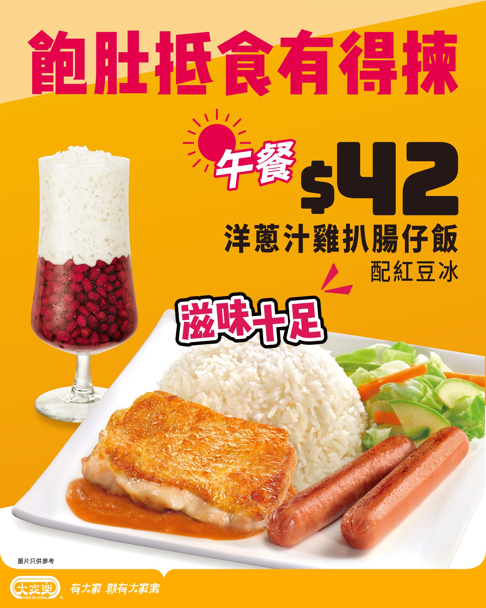 供應情況:視乎分店而定#CafedeCoral#CafedeCoralhk#大家樂#有大家就有大家樂#午市之選#飽肚抵食有得揀#洋蔥汁雞扒腸仔飯#紅豆冰
