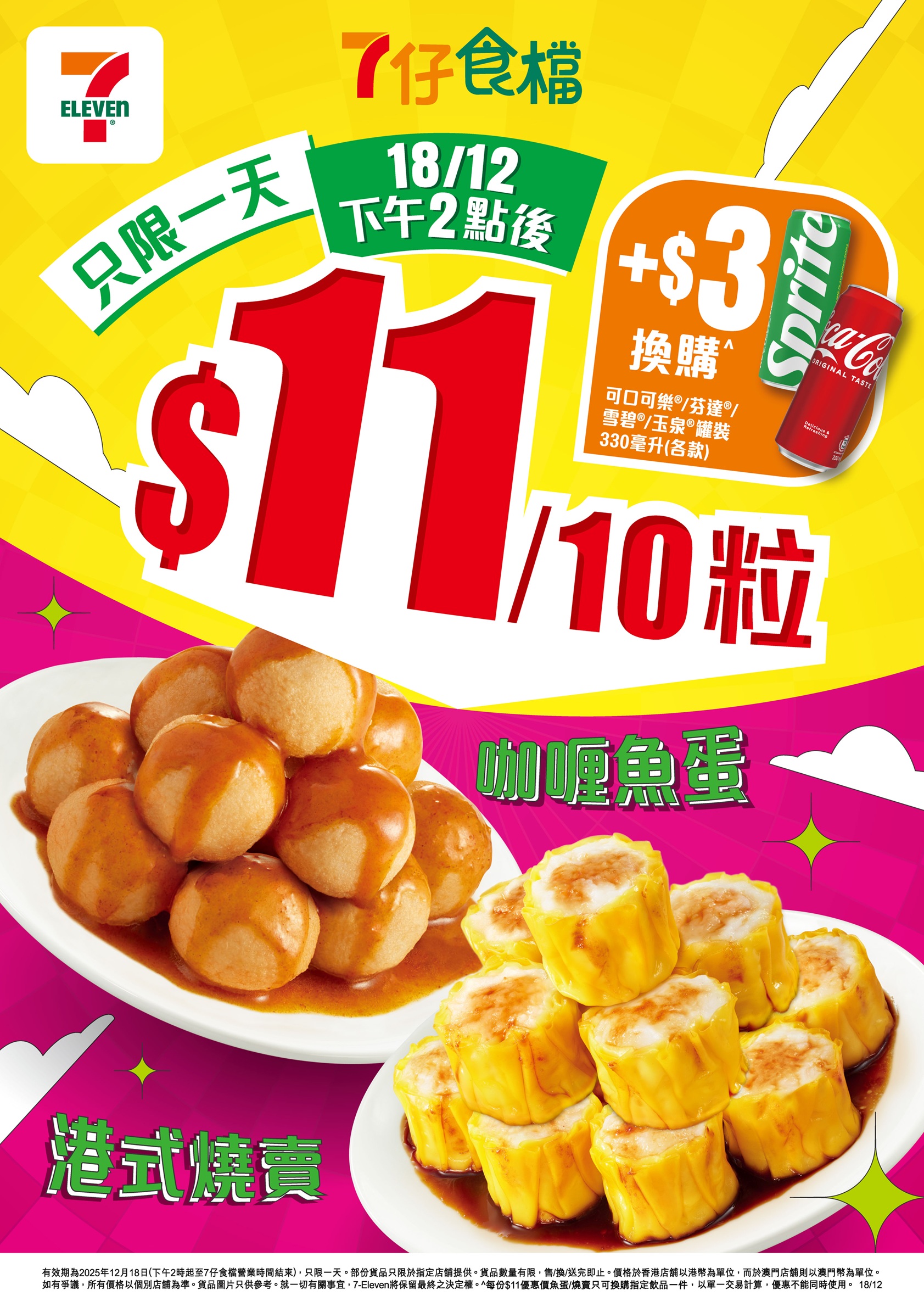 *有效期為2025年12月18日 (下午2時至個別店舖7仔食檔營業時間結束),只限一天。部份貨品只限於指定店舖提供。貨品數量有限,售/換/送完即止。如有爭議,所有價格以個別店舖為準。貨品圖片只供參考。優惠受條款及細則約束,詳情請參閱店內宣傳品。