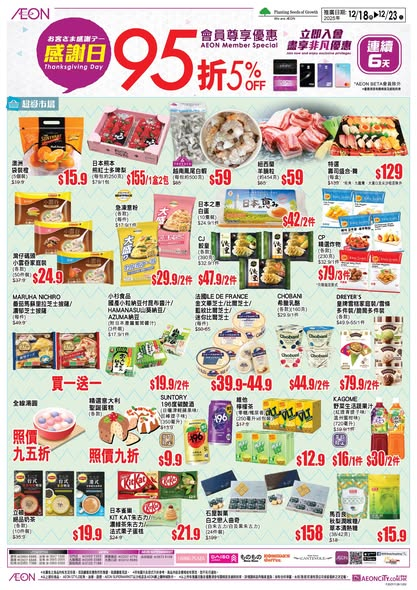 12月18日至12月23日於「感謝日」期間憑會員卡/指定AEON信用卡以指定付款方式購物,即可享有即時照價九五折優惠** 即刻㩒入嚟睇吓有咩筍貨啦~