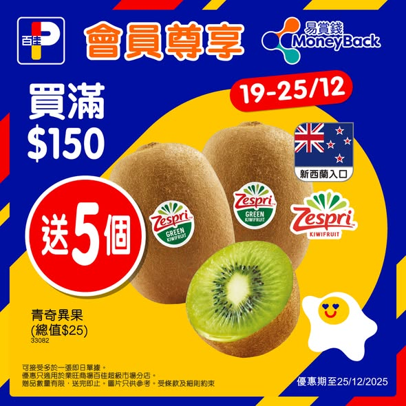 滿$150送 Zespri 青奇異果5個 * 仲未登記做會員? 喺12月19 – 21日過嚟搵我地登記做會員,仲即送你