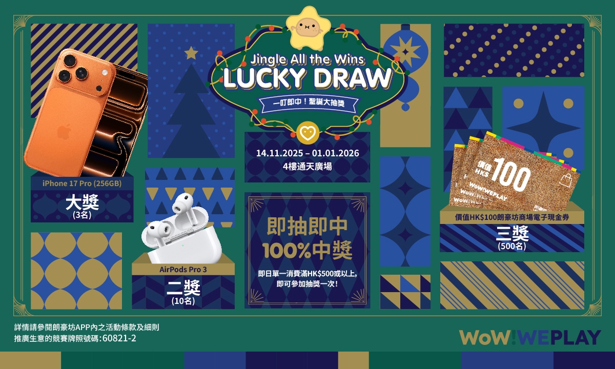 早前登場的 Noodoll「薯誕百貨」深受歡迎,成為全城矚目的打卡焦點。場內以Noodoll薯仔家族為主題,營造充滿節日氛圍的場景,吸引大批顧客前來拍下最吸Like的節日美照。除了必拍場景外,朗豪坊更特別推出「一叮即中!聖誕大抽獎」,送出過萬份豐富禮遇,LP CLUB會員以電子支付方式單一消費滿HK$500,即可參加抽獎一次,新會員更可享額外一次抽獎機會,人人有獎。獎品包括 iPhone 17 Pro、AirPods Pro 3、全城熱搶的Noodoll獨家限定版包裝薯片盲盒電話繩、大量薯寶吊飾,以及朗豪坊電子現金券等,為佳節增添無限驚喜。