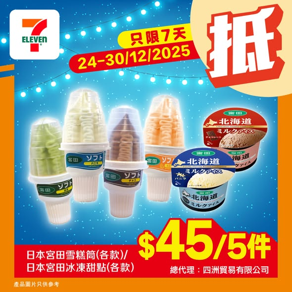 平均每件$9 *優惠有效期由2025年12月24日早上7時至12月30日。優惠只適用於香港店舖。部分貨品只限於指定店舖提供。貨品數量有限,售完即止。如有爭議,所有價格以個別店舖為準。貨品圖片只供參考。就一切有關事宜,7-Eleven將保留最終之決定權。