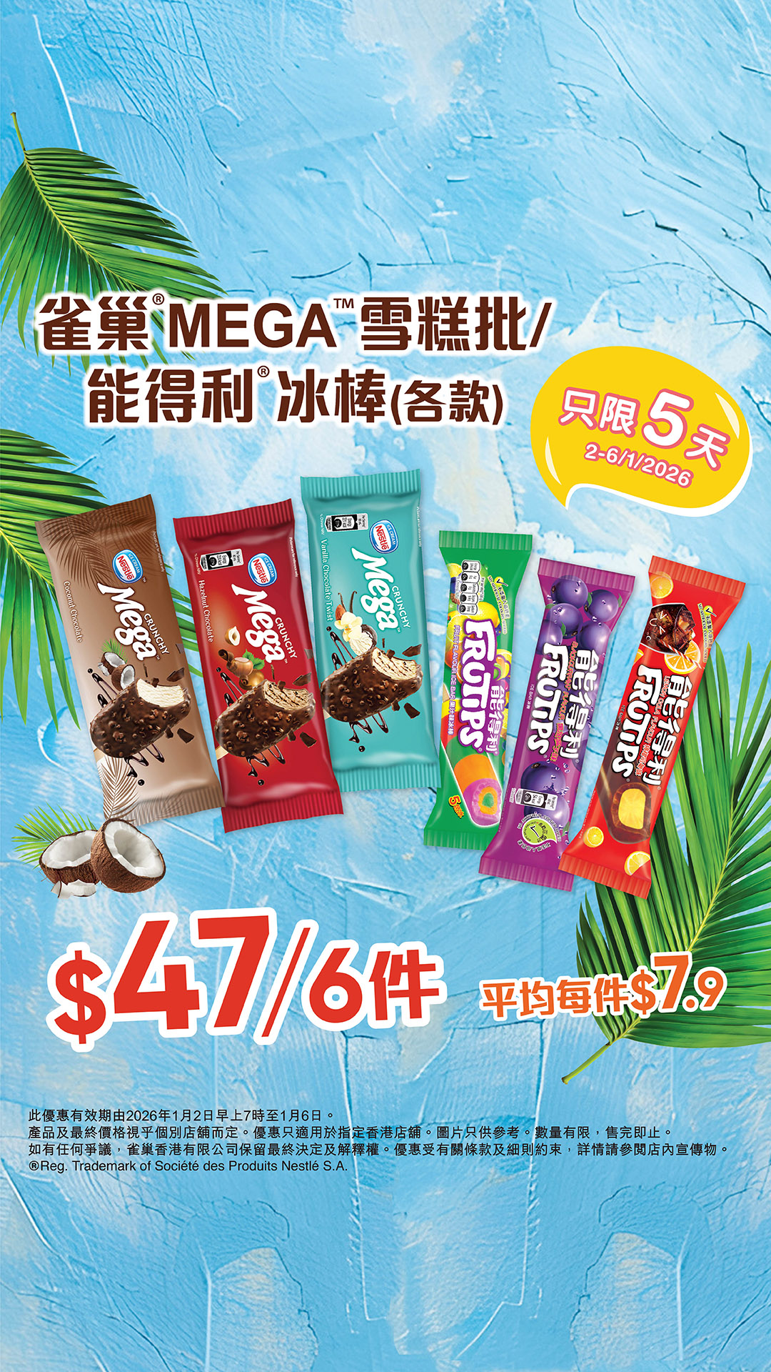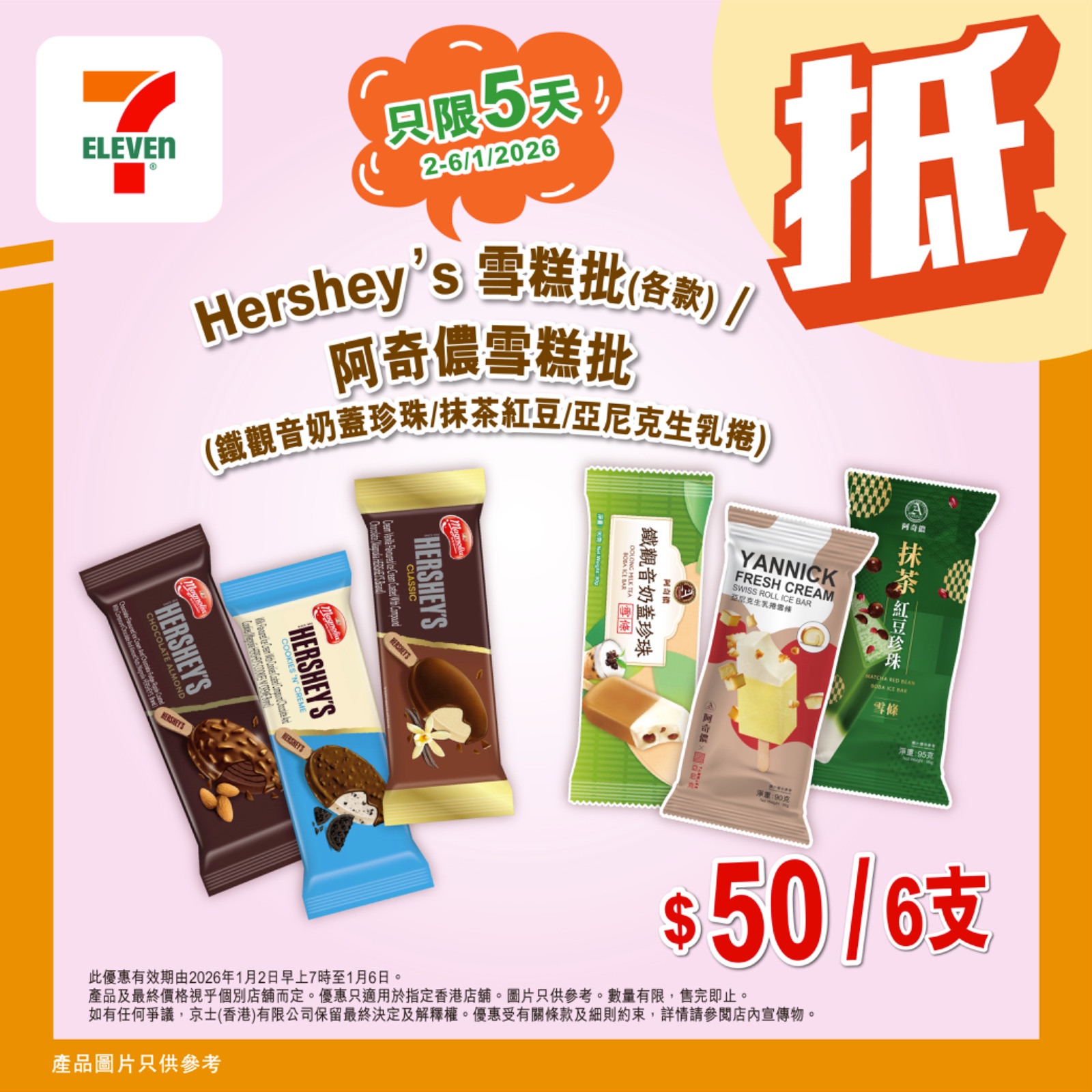 *優惠有效期由2026年1月2日早上7時至1月6日。優惠只適用於香港店舖。部分貨品只限於指定店舖提供。貨品數量有限,售完即止。如有爭議,所有價格以個別店舖為準。貨品圖片只供參考。就一切有關事宜,7-Eleven將保留最終之決定權。