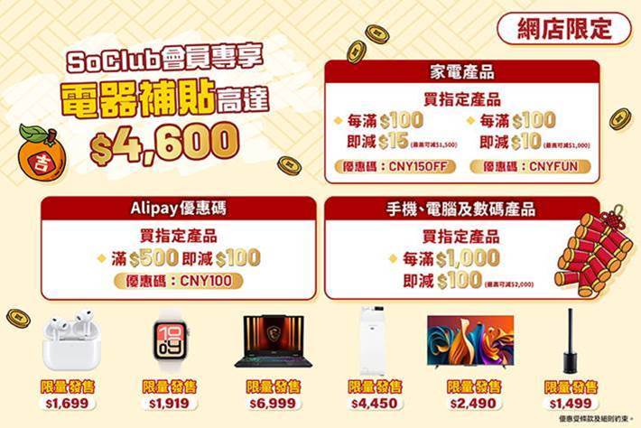 辭舊迎新,喜迎佳節!想為親人、朋友及另一半送上最貼心的祝福,實用的智能產品及家庭電器絕對是送禮首選。香港蘇寧全新《馬踏祥雲迎新歲》優惠強勢啟動,全場精選產品低至47折發售。SoClub會員更可專享電器補貼優惠:蘇寧門市家電補貼高達$1,050,而網店電器補貼更高達$4,600!立即來蘇寧入手心水電器,為家居增添新氣象,優惠期由即日起至2026年3月3日。