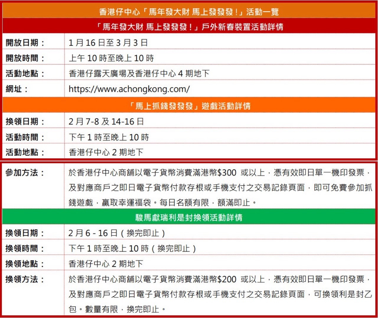 除了一連串滿Fun 爆Luck的新春打卡裝置外,香港仔中心特意趁佳節送上2大「好運滿馬」雙重消費禮遇!於2月7-8及14-16日憑消費即可免費參加抓錢遊戲,贏取幸運福袋,祝願大家駿馬生財,「馬」上行大運!另外,2月6-16日,只需憑消費更可換領駿馬獻瑞利是封,將誠摯祝福傳遞給摯愛的親友,共迎新春喜悅!