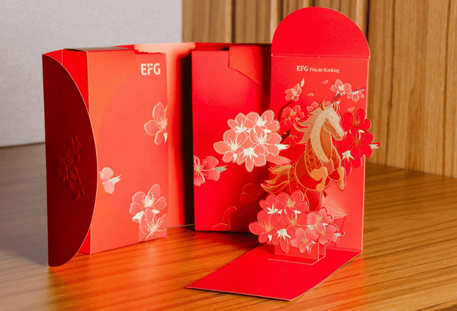 農曆新年將至, EFG 銀行為即將到來的馬年所設計的利是封。作為一間總部位於瑞士蘇黎世、以企業家精神為核心的全球私人銀行,EFG 始終致力於將傳統與創新相結合,而這款利是封正展現了獨特的東方美學與精湛工藝。