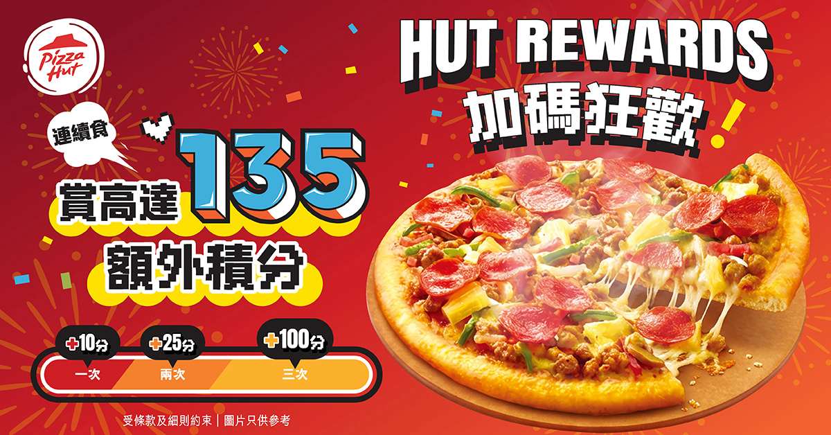 為慶祝「國際Pizza日」,Pizza Hut 特別推出「積分加碼狂歡賞」,等各位Pizza忠粉賺住慶祝!由2月5日至3月4日,Hut Rewards會員凡於Pizza Hut消費包括堂食點餐、外賣自取、外送速遞及預訂美食(不包括第三方外送平台訂單),首三次合資格消費(滿$50或以上)即可享額外積分,第一次合資格消費可享額外10積分,第二次合資格消費可享額外25積分,第三次合資格消費可享額外100積分,每位會員最多可額外賺取135分!!額外Hut Rewards積分更可用於下次消費時免費兌換不同皇牌美食及必勝批!無論你食得多或少,只要三次消費均滿$50或以上,額外135積分即輕鬆到手!機會難得,即刻拉埋朋友嚟賺分,一齊食多啲賺多啲😎!未做會員嘅你立即下載Pizza Hut手機應用程式成為Hut Rewards會員,賺埋$530迎新優惠,一齊豐收過年!