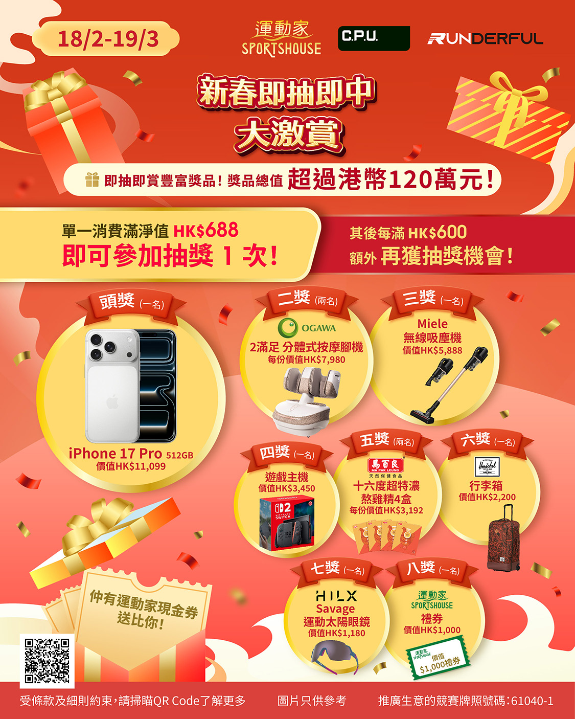 由 2026 年 2 月 18 日(星期三)至 3 月 19 日(星期四),顧客只需成為運動家 APP 會員,消費滿淨值 HK$688(單一發票) 即可獲抽獎機會 1 次;其後每滿 HK$600可再獲抽獎機會