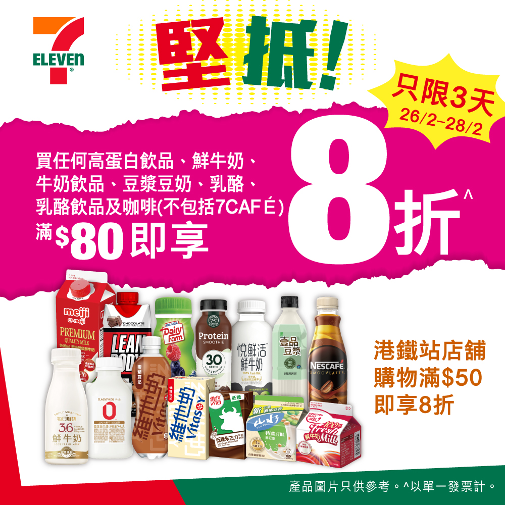 *優惠有效期由2026年2月26日早上7時至2月28日。以單一發票計算。優惠只適用於香港店舖。部分貨品只限於指定店舖提供。貨品數量有限,售 / 送 / 換完即止。價格於香港店舖以港幣為單位。如有爭議,所有價格以個別店舖為準。貨品圖片只供參考。就一切有關事宜,7-Eleven 將保留最終之決定權。