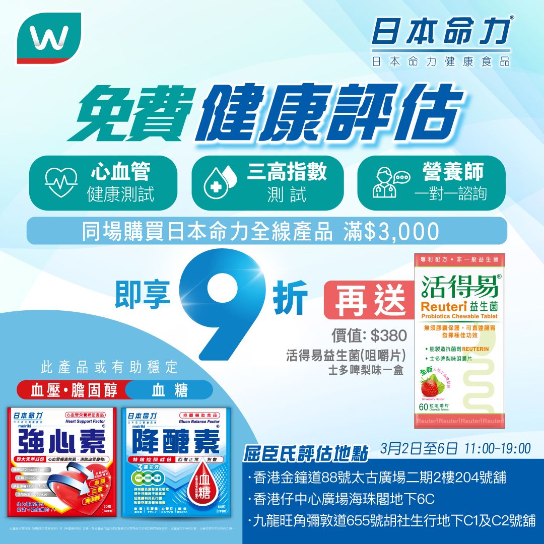 】由2026年3月2日起至3月6日,日本命力 x 屈臣氏專業健康團隊於屈臣氏金鐘太古廣場店、香港仔海珠閣店及旺角胡社生行店,為大家提供免費健康評估*