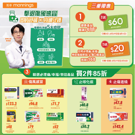 萬寧官方網店購物優惠由上午6時至晚上11時59分,數量有限,送/售完即止。部份產品/優惠不適用於澳門分店/萬寧官方網店,優惠受條款及細則約束,詳情請參閱 www.mannings.com.hk。須買上述指定件數方享贈品/換購品/折扣優惠,數量有限,送/換/售完即止。推廣優惠及贈品只適用於部份香港萬寧店鋪,不適用於foodpanda mall、wwwtc mall、港鐵車站、香港機場及離港口岸之分店。所有價格以店鋪為準。如有爭議,萬寧保留最終之決定權。詳情請查閱店內宣傳品。香港分店一切價格均以港元計算;澳門分店一切價格則以澳門元計算。