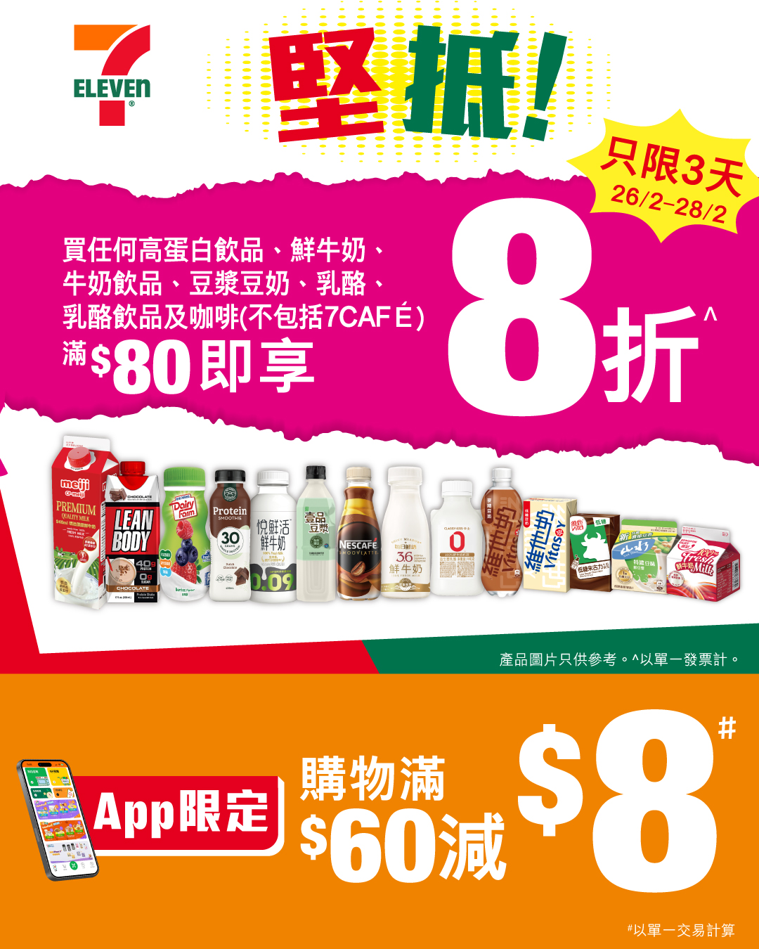 *優惠有效期由2026年2月26日早上7時至2月28日。以單一發票計算。優惠只適用於香港店舖。部分貨品只限於指定店舖提供。貨品數量有限,售 / 送 / 換完即止。價格於香港店舖以港幣為單位。如有爭議,所有價格以個別店舖為準。貨品圖片只供參考。就一切有關事宜,7-Eleven 將保留最終之決定權。