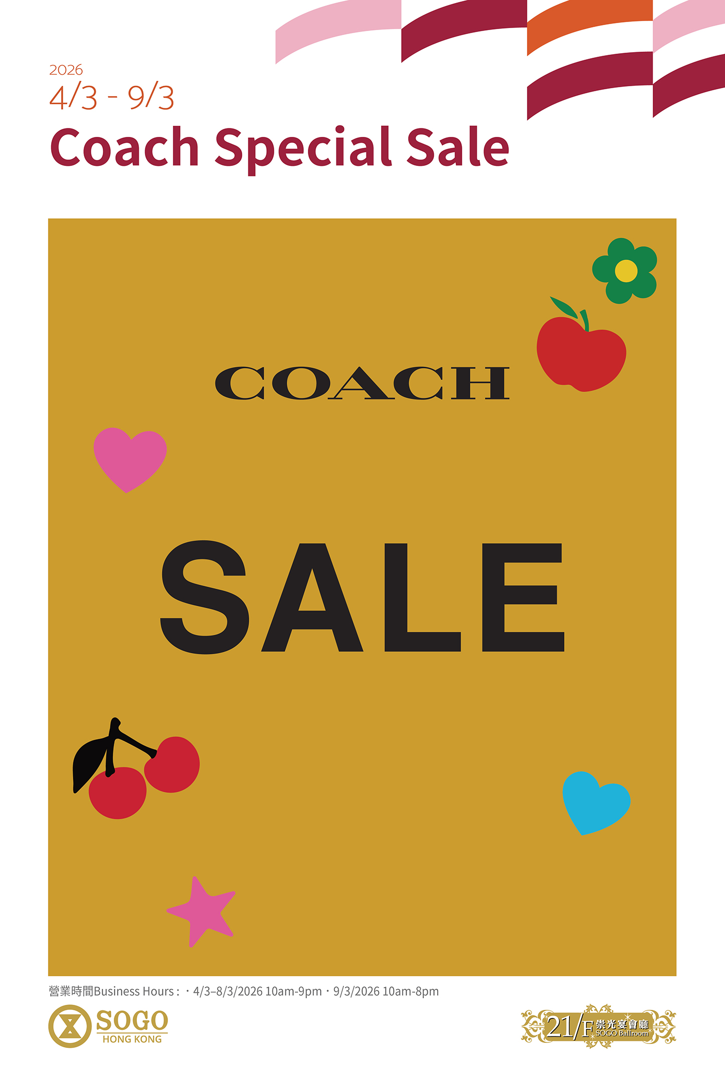 由4/3至9/3/2026期間,Coach Special Sale於崇光銅鑼灣店21/F崇光宴會廳舉行,歡迎親臨選購精選貨品。