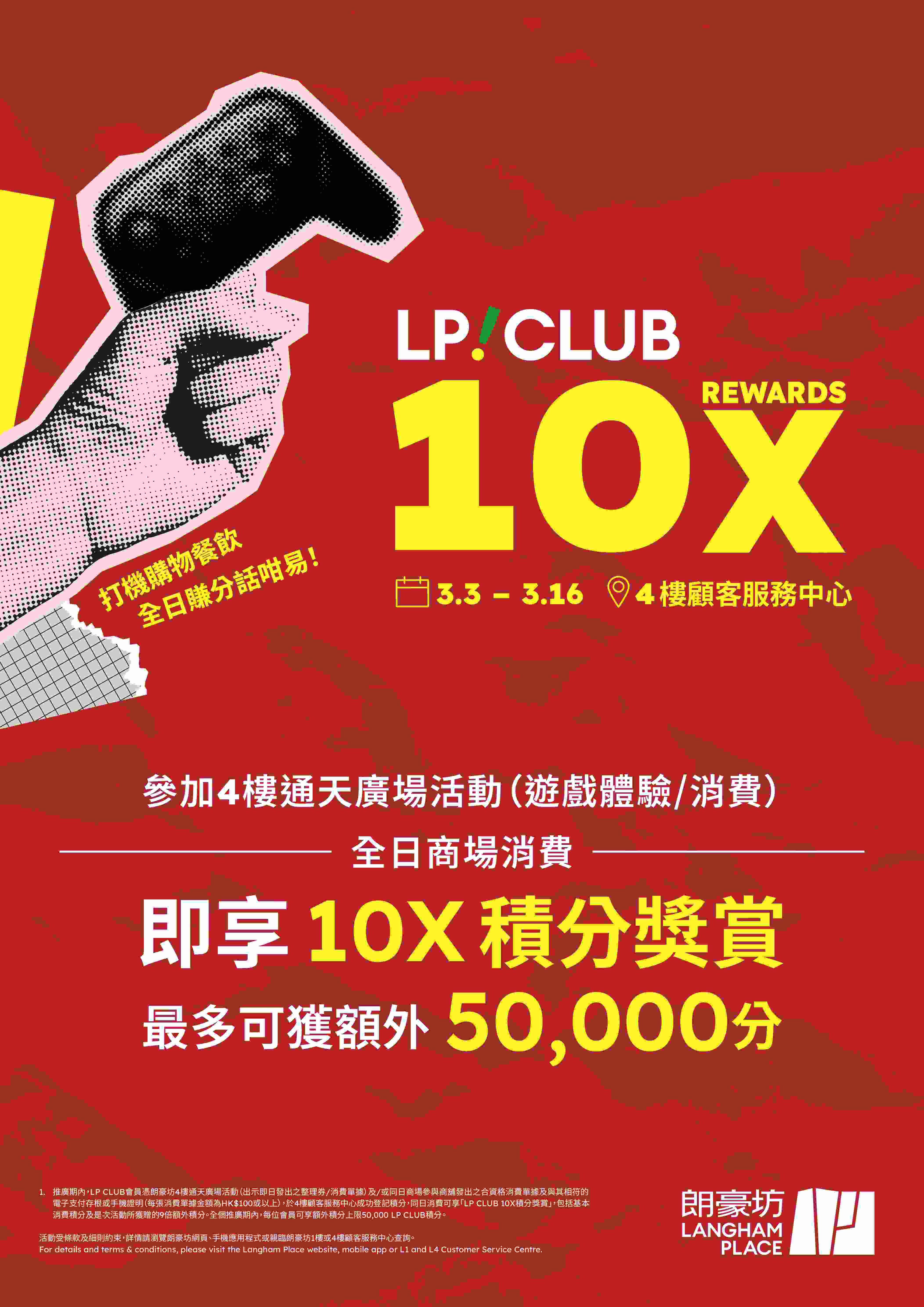同場加映,朗豪坊特別為LP CLUB會員推出尊屬積分獎賞。由 3 月 4 日至 3 月 16 日,LP CLUB會員於 4 樓通天廣場參加遊戲體驗或消費,憑即日發出之整理券/消費單據,及/或同日商場參與商舖發出之合資格消費單據,即可於 4 樓顧客服務中心登記,享有全日消費10X積分獎賞,最多可獲額外50,000分,讓顧客在打機、購物及餐飲之餘,全日輕鬆賺分,盡享尊貴禮遇。