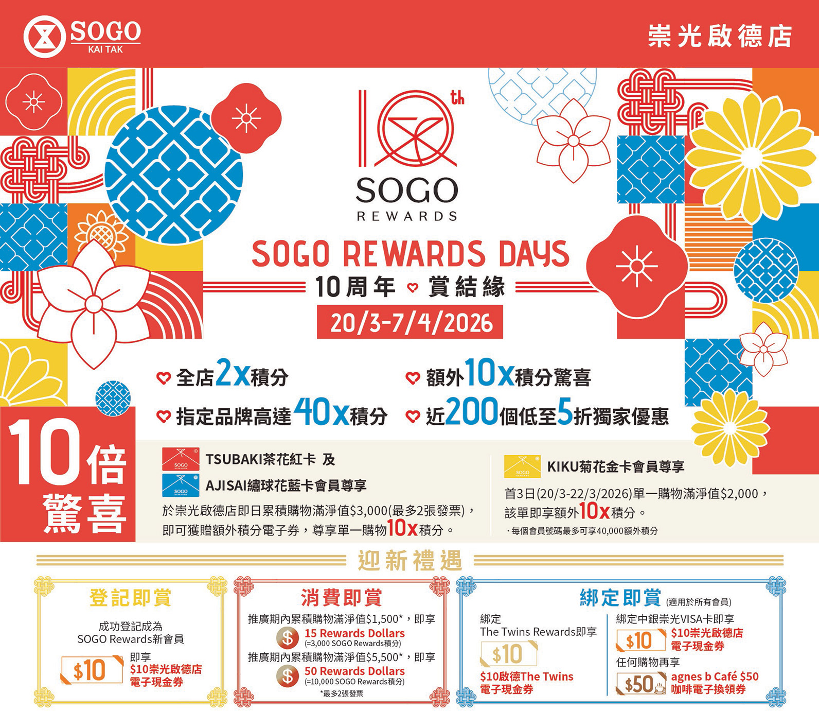 為誠邀更多顧客會員,共同譜寫下一個精彩十年,SOGO Rewards特別為新會員送上迎新禮遇。凡於推廣期間成功登記為SOGO Rewards新會員即可獲贈崇光啟德店$10電子現金券;活動期間累積消費(最多2張發票)滿淨值$1,500可獲3,000額外積分,或滿淨值$5,000可獲高達10,000額外積分,入會即賺,消費越多回贈越高。