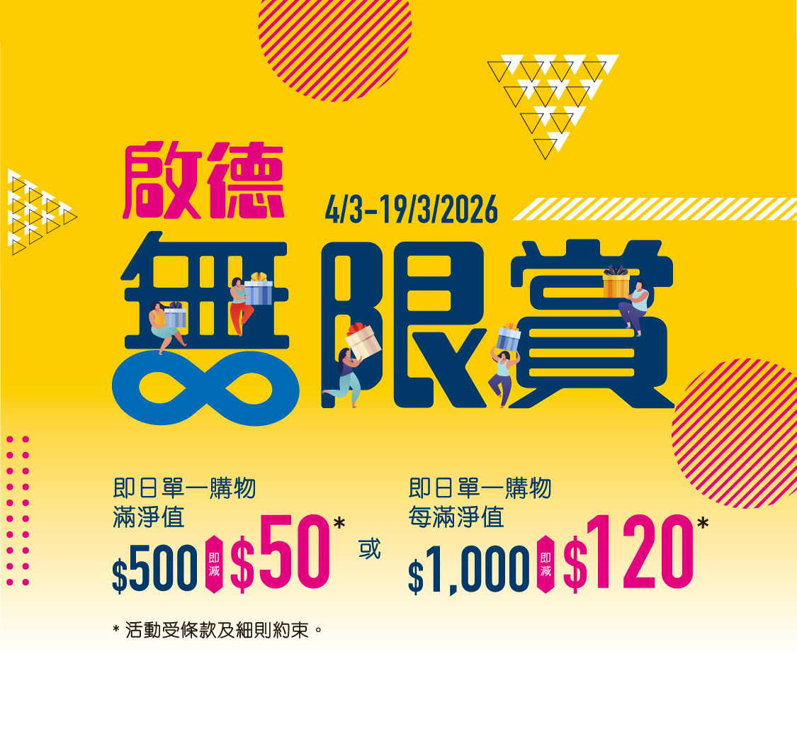 「啟德無限賞」活動期間,顧客凡於崇光啟德店即日單一購物滿淨值$500,即減$50;每滿淨值$1,000即減$120,如此類推。優惠以單一發票計算,且不設減免上限,買得越多,優惠越大!顧客只需於樓層指定收銀處付款,便可享即時帳單扣減,毋須等待。