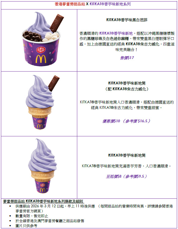 全新「KITKAT®香芋味新地系列」分別以不同價格供應,包括至抵價$8 KITKAT®香芋味新地筒(參考價$9.5)、優惠價$10KITKAT®香芋味新地筒配KITKAT®朱古力威化(參考價$16.5),及$17KITKAT®香芋味黑白芭菲*,歡迎大家不論享用麥當勞美食後或放工放學,享用「KITKAT®香芋味新地系列」甜品,為自己生活加添一點甜蜜幸福。