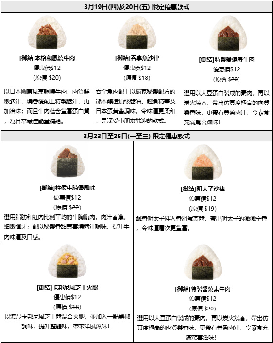 華御結$12「皇牌御結日」於3月19日至25日(星期六及日除外)再次回歸,一連5日為御結迷帶來人氣定番及新品超值之選!精選款式包括[御結]本格和風燒牛肉(原價 $20)、 [御結] 吞拿魚沙律(原價 $18)、[御結] 特製醬燒素牛肉(原價 $20)、[御結] 明太子沙律(原價 $19)、[御結]卡邦尼風芝士火腿(原價$18)及首次加入優惠,並好評如潮的 [御結]柱侯牛腩煲風味(原價 $22)。口味多樣化,總有至啱口味!數量有限,售完即止。