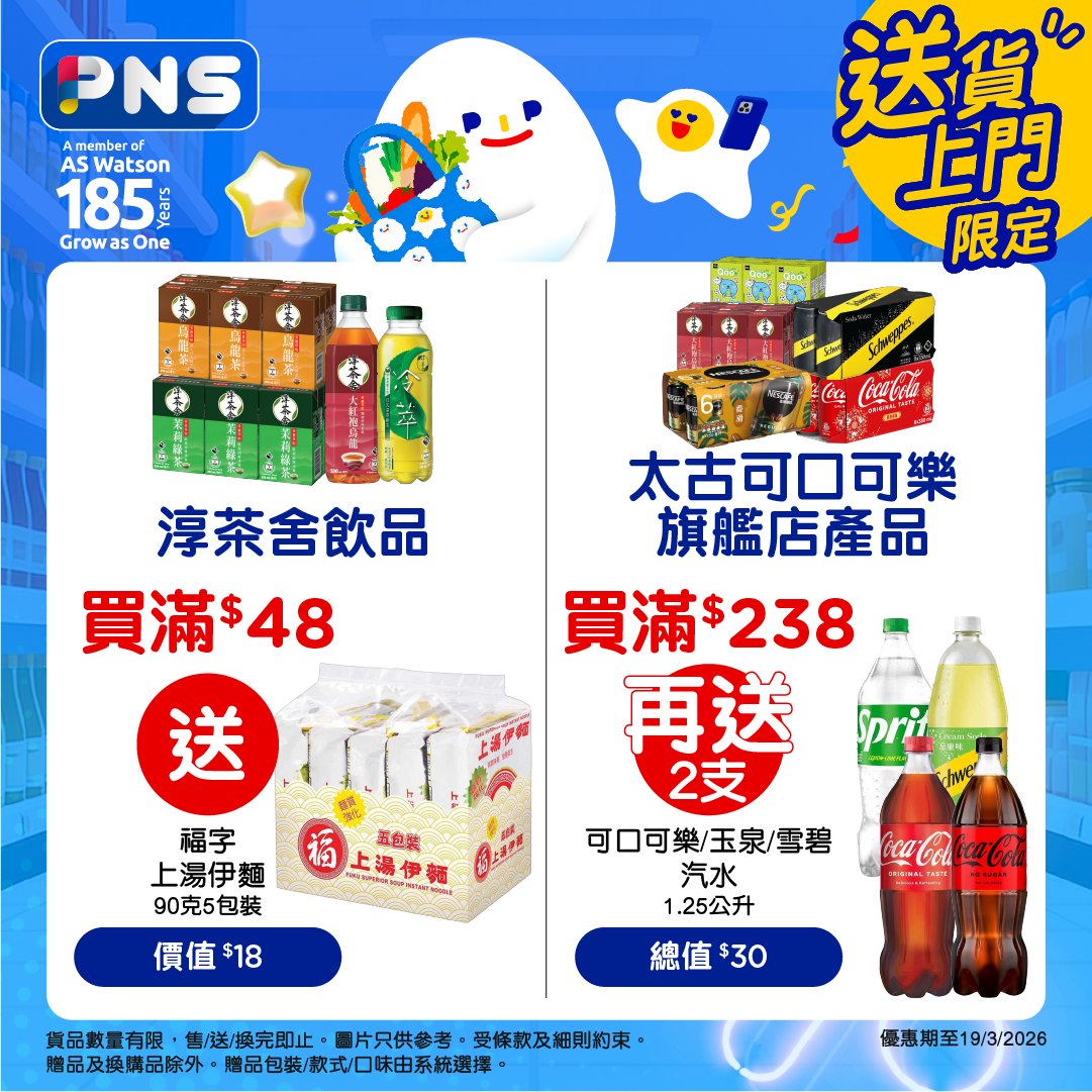 買2箱9折優惠期至2026年3月19日。紙包茶類飲品優惠適用於有售賣此貨品之香港百佳店舖及PNS網購。其他優惠只適用於PNS網購。需登入PNS網購以查看贈品優惠。贈品數量有限,送完即止。優惠以每張訂單計算。圖片只供參考。受條款及細則約束。