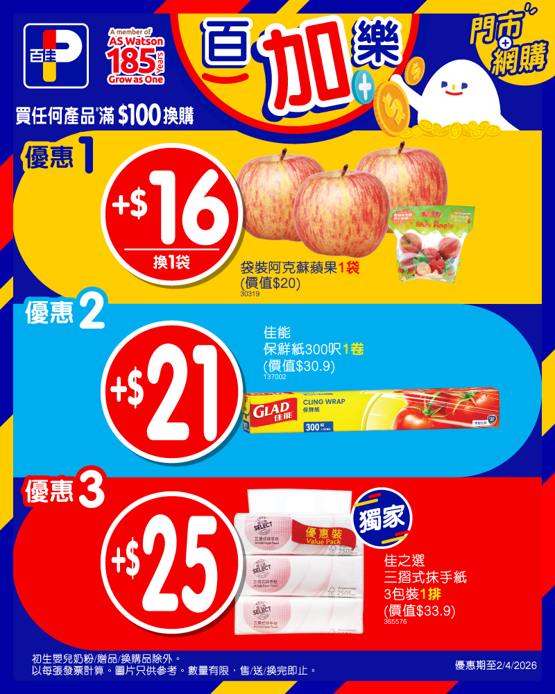 *優惠至2/4/2026。以上優惠適用於大部分香港百佳、FUSION、TASTE、INTERNATIONAL 有售,並不適用於百佳旗下的其他超市品牌、百佳快閃特賣埸及新鮮食品優惠並不適用於 TASTE x FRESH 新鮮生活之店舖。貨品數量有限,售/送/換完即止。圖片只供參考。受條款及細則約束。以每張發票計算。# 初生嬰兒奶粉、贈品及換購品除外