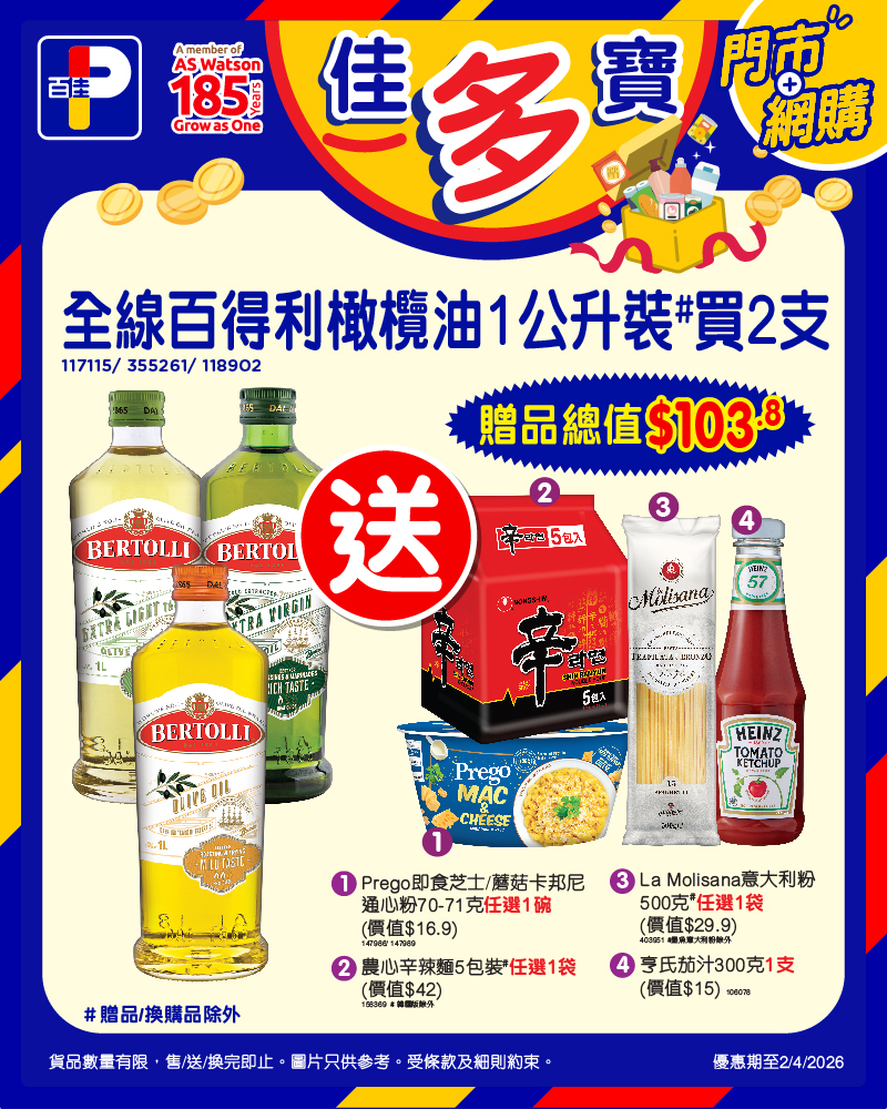 *優惠至2/4/2026。以上優惠適用於大部分香港百佳、FUSION、TASTE、INTERNATIONAL 有售,並不適用於百佳旗下的其他超市品牌、百佳快閃特賣埸及新鮮食品優惠並不適用於 TASTE x FRESH 新鮮生活之店舖。貨品數量有限,售/送/換完即止。圖片只供參考。受條款及細則約束。以每張發票計算。# 贈品及換購品除外 ^韓國版除外 **墨魚意大利粉除外
