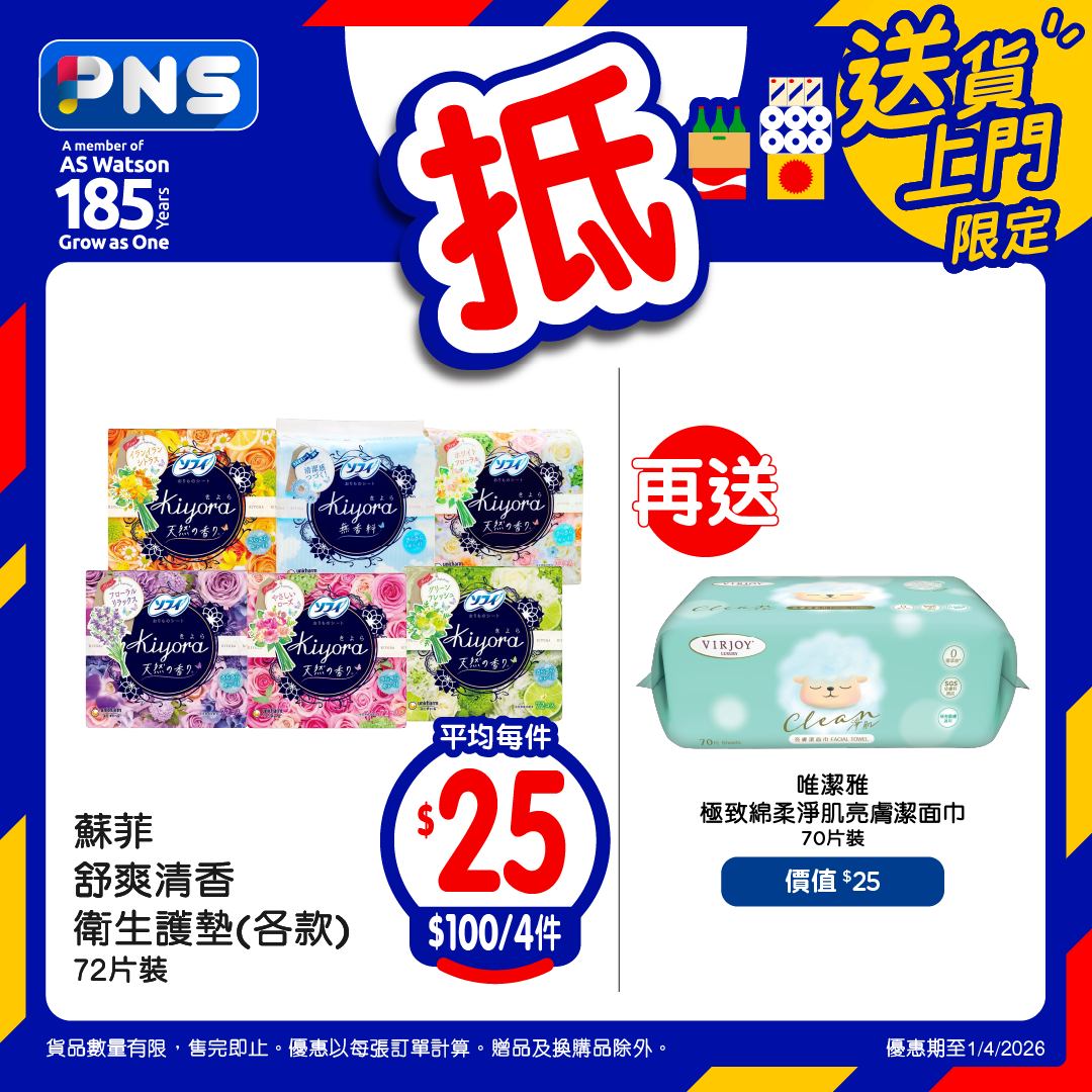 再送唯潔雅極致綿柔淨肌亮膚潔面巾70片裝優惠期至2026年4月1日。優惠只適用於PNS網購之送貨訂單。優惠以每張訂單計算。圖片只供參考。受條款及細則約束。