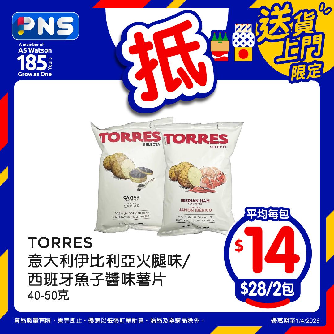 TORRES意大利伊比利亞火腿味/西班牙魚子醬味薯片40-50克,優惠價$28/2件,平均$14/件