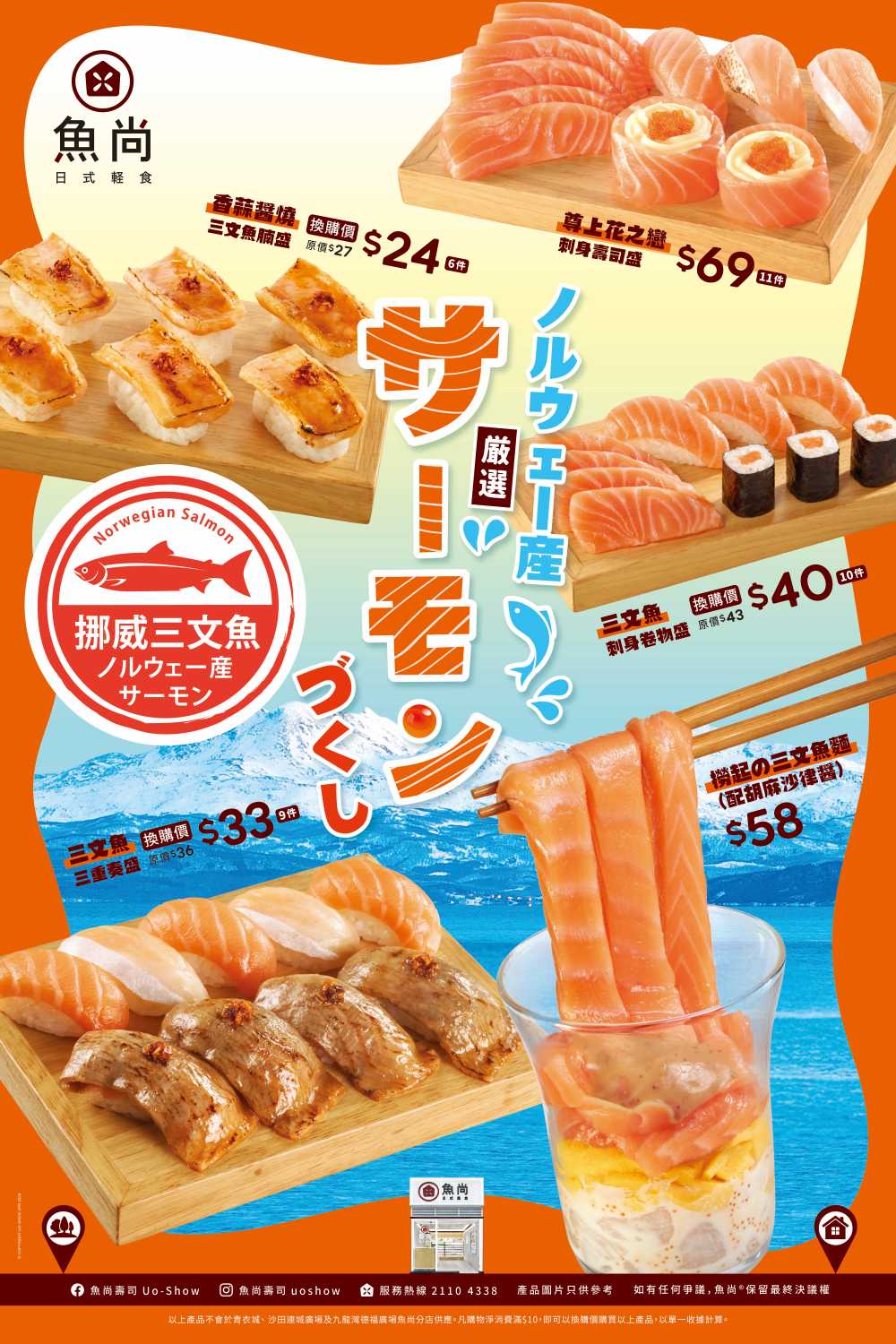 魚尚今次一口氣集結多款人氣壽司盛合,由經典不敗到創新配搭,總有一款啱你口味!一向被譽為「人氣王」的三文魚,當之無愧繼續擔正「C位」,款款新品都有挪威三文魚的蹤影,以優質養殖三文魚帶來信心保證的最愛壽司滋味!作為世界上最大的大西洋三文魚生產國,挪威三文魚養殖過程備受嚴格規管,包括飼料、養殖環境,以至出口安排等,成為品質及食物安全的保證,絕對是三文魚界的「最dope」之選!多款由三文魚領軍的新品由即日起登陸魚尚,必試推介包括靈感源自「撈起」習俗的超創新「撈起の三文魚麵(配胡麻沙律醬)」(港幣$58)、只售港幣$20的「香蒜三文魚薄切壽司盛(5件)」、港幣$24的「香蒜醬燒三文魚腩盛(6件)」,以及只需港幣$33的「三文魚三重奏盛(9件)」,如果想更豐盛,必試同樣以「超驚喜」價登場的「尊尚花之戀刺身壽司盛(11件)」(港幣$69)、滿足一眾三文魚控的「三文魚刺身卷物盛(10件)」(港幣$40)和「三文魚海鮮盛(10件)」(港幣$39),另外當然亦不可錯過王牌之選「三文魚壽司盛(10件)」(港幣$36)!返工返學路過,順手帶走一盒「鮮」氣滿滿的幸福滋味,為忙碌日常加加油!