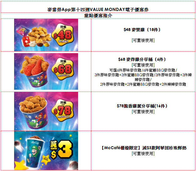 復活節長假期即將來臨,麥當勞App由明天4月3至7日限時推出復活節震撼優惠:包括$48麥樂雞(18件)、$68 麥炸雞分享桶(6件)及$78脆香雞翼分享桶 (16件),讓大家可以麥當勞美食與親友歡聚開派對!同時,McCafé櫃檯亦一同投入《超級瑪利歐銀河電影》熱潮,即日起新上架的阿華田珍珠鮮奶以路易吉(Luigi)限定包裝驚喜現身,歡迎粉絲一邊暢飲一邊打卡。