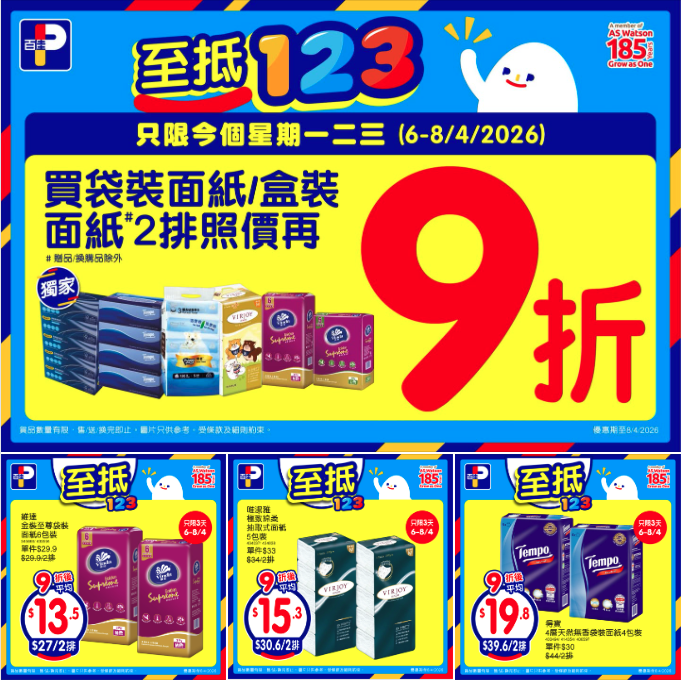 今個星期一、二、三: 買袋裝同盒裝面紙2排 即享9折!