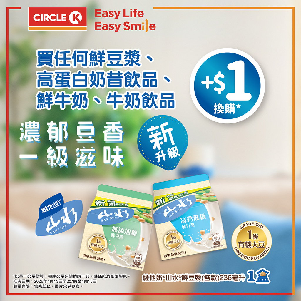 由4月13日早上7時至15日,嚟Circle K 買任何鮮豆漿、高蛋白奶昔飲品、鮮牛奶、牛奶飲品,即可 +$1 換購#維他奶山水鮮豆漿236毫升1件*。全新升級配方,豆味更濃郁醇厚,入口香滑,幸福感爆燈!