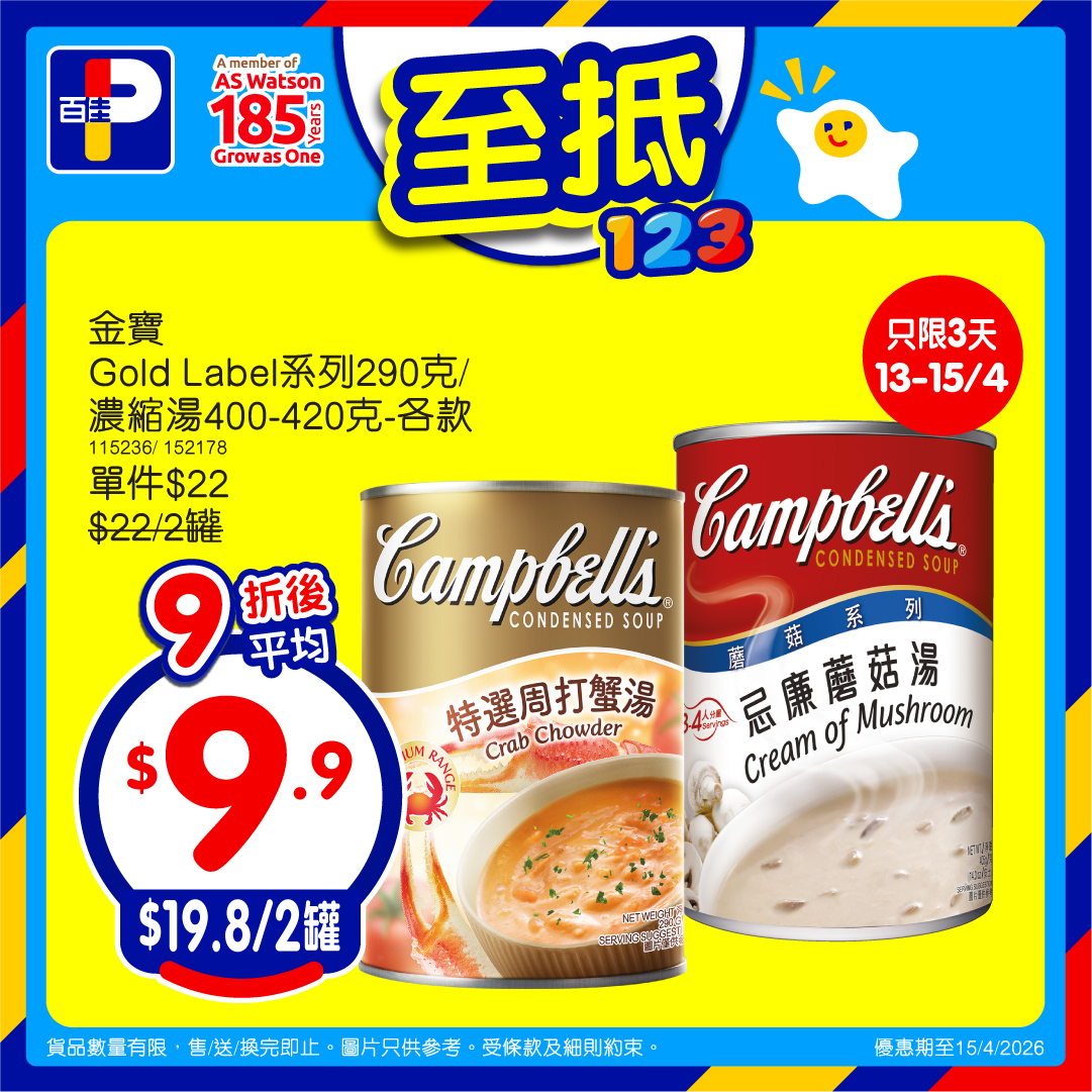 *優惠期至15/4/2026。以上優惠適用於大部分香港百佳、FUSION、TASTE、INTERNATIONAL 及 PNS 網購有售,並不適用於百佳旗下的其他超市品牌、百佳快閃特賣埸。貨品數量有限,售/送/換完即止。圖片只供參考。受條款及細則約束。以每張發票計算。