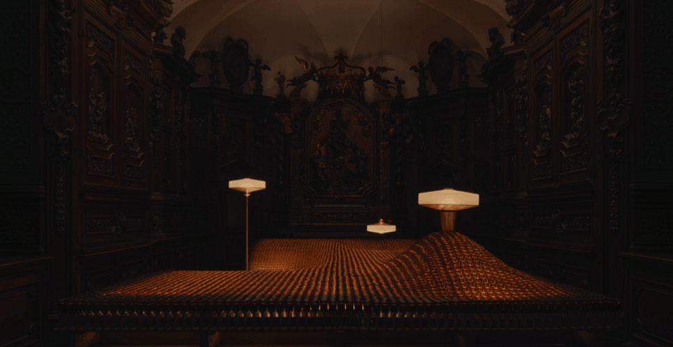 Within the cloister of Santa Maria del Carmine, The Factory of Light celebrates the precision ofhuman hands that conjure light through craft. The structure’s translucent walls were erected fromscaffolding, wrapped in salvaged trompe-l’œil tarpaulins. Originally used to shroud notablebuildings undergoing restoration, these materials speak to the effort of preserving a legacy—and