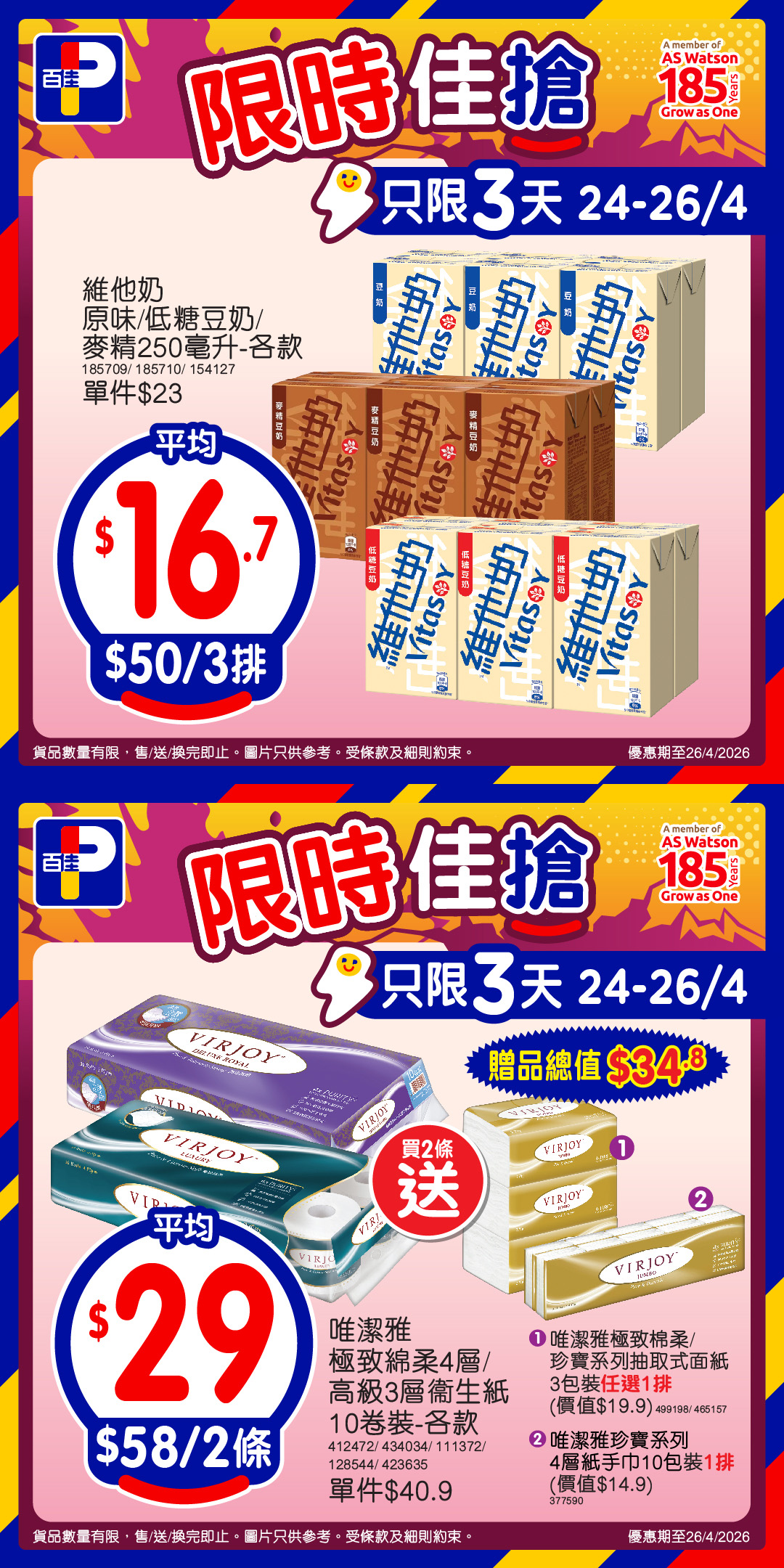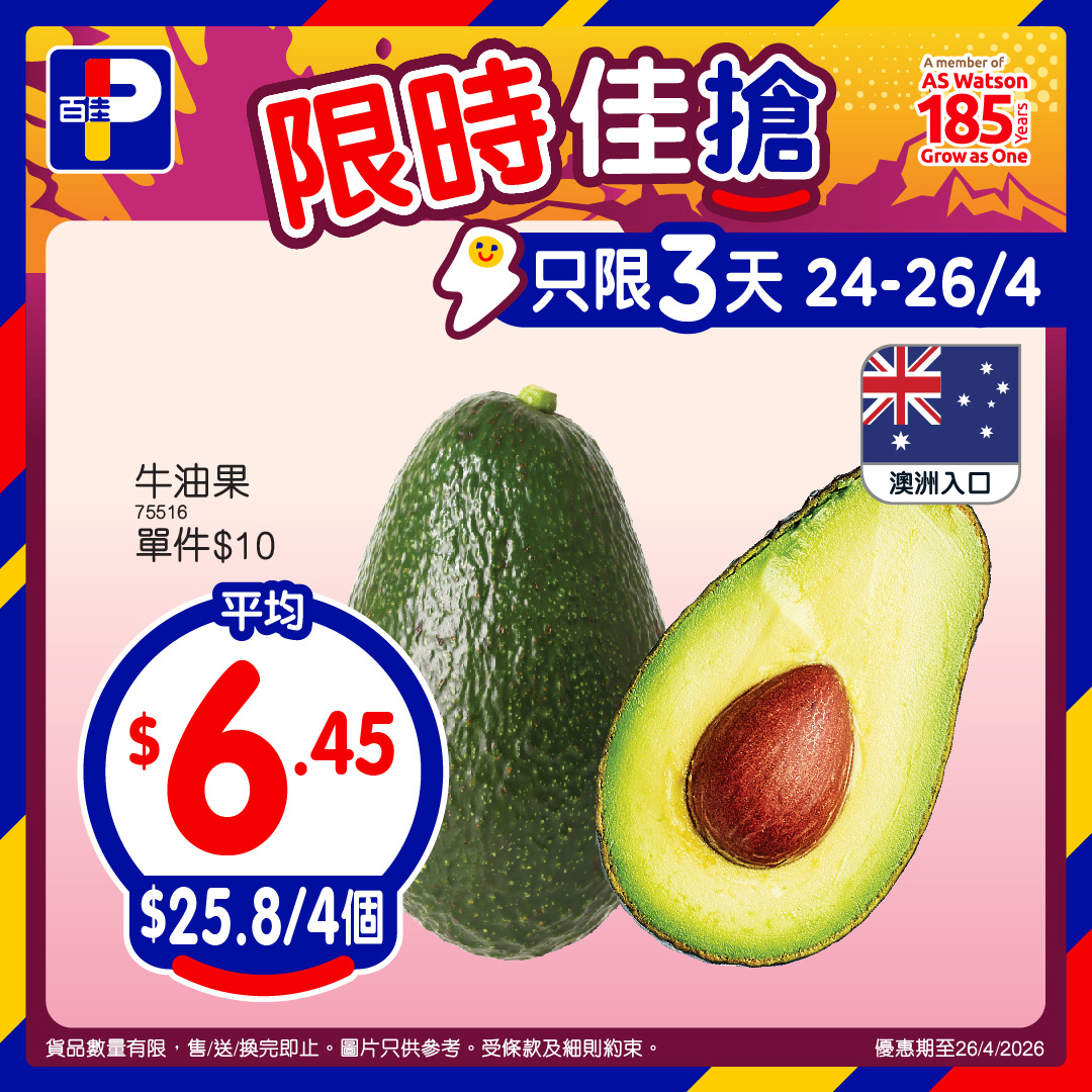 *優惠期至26/4/2026,以上優惠適用於大部分香港百佳、FUSION、TASTE、INTERNATIONAL及PNS網購有售,並不適用於百佳旗下的其他超市品牌及百佳快閃特賣埸。貨品數量有限,售/送/換完即止。圖片只供參考。 受條款及細則約束。贈品/換購品除外。以每張發票計算。