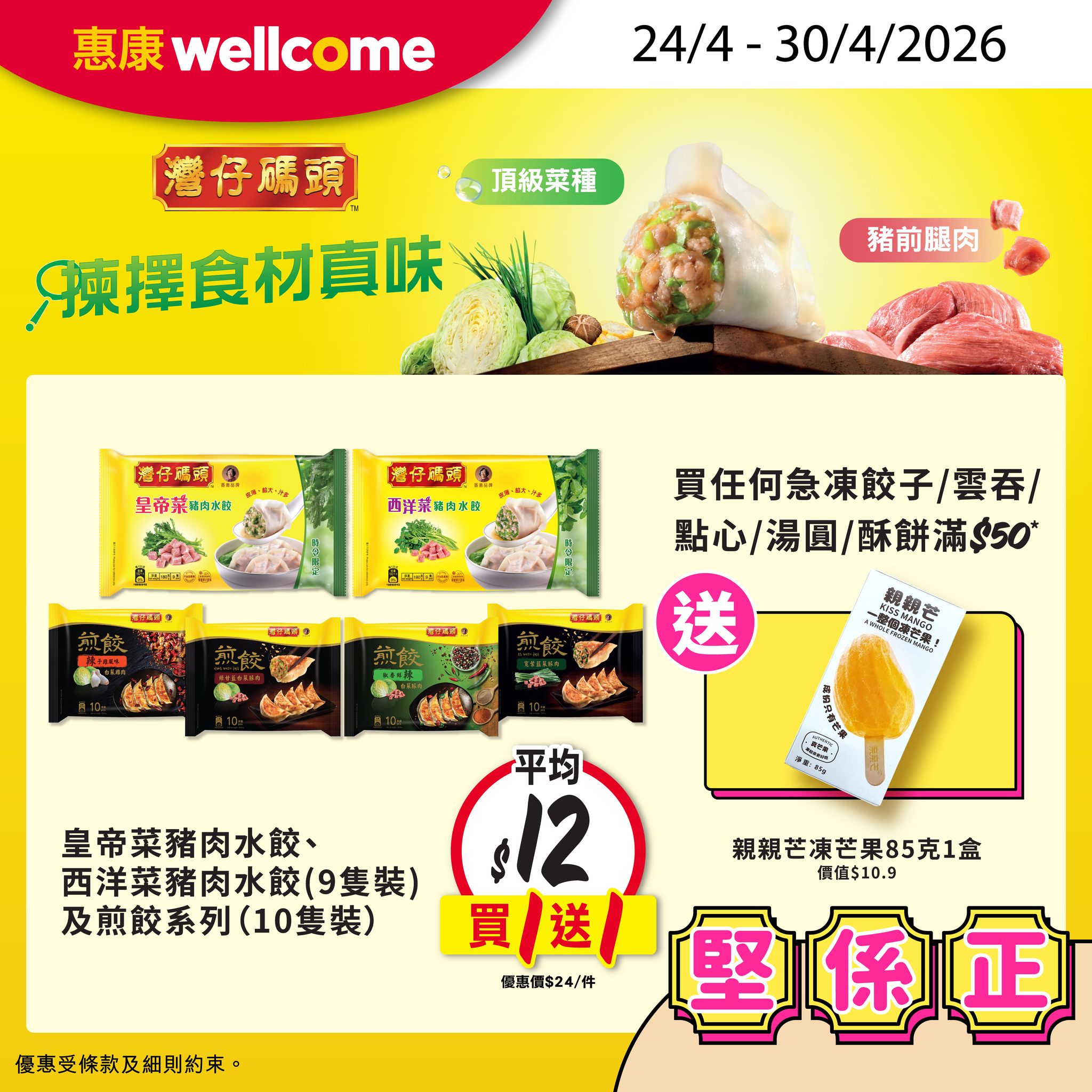 部分優惠適用於惠康網店/Market Place網店/yuu網購。以單一發票及折實價計算。貨品/ /贈品數量有限,送/售完即止 。部分貨品只限指定分店提供。優惠受條款及細則約束。貨品圖片只供參考。