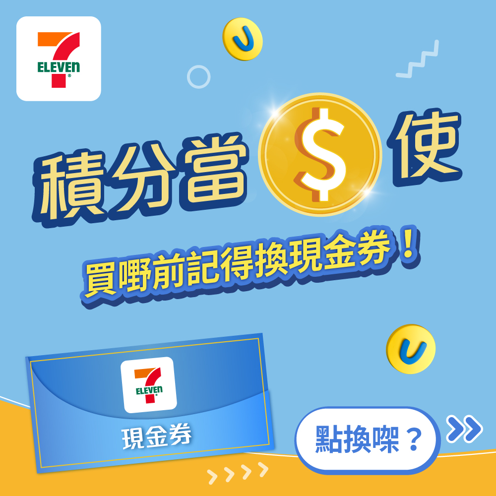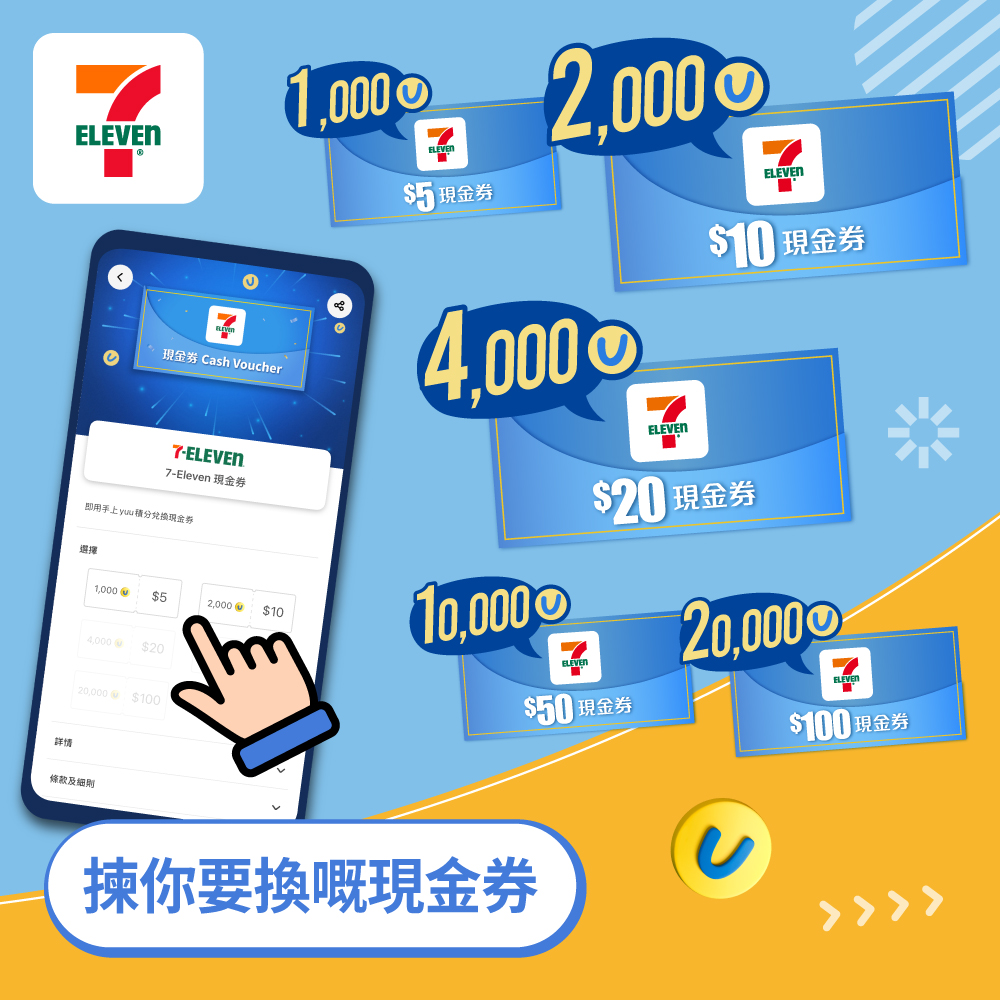 現金券必須在兌換一年內使用,逾期作廢。適合香港及澳門7-Eleven使用。現金券祇可兌換7-Eleven貨品,不設找續。現金券不適用於其他服務項目。優惠受有關條款及細則約束,詳情請參閱yuu應用程式。