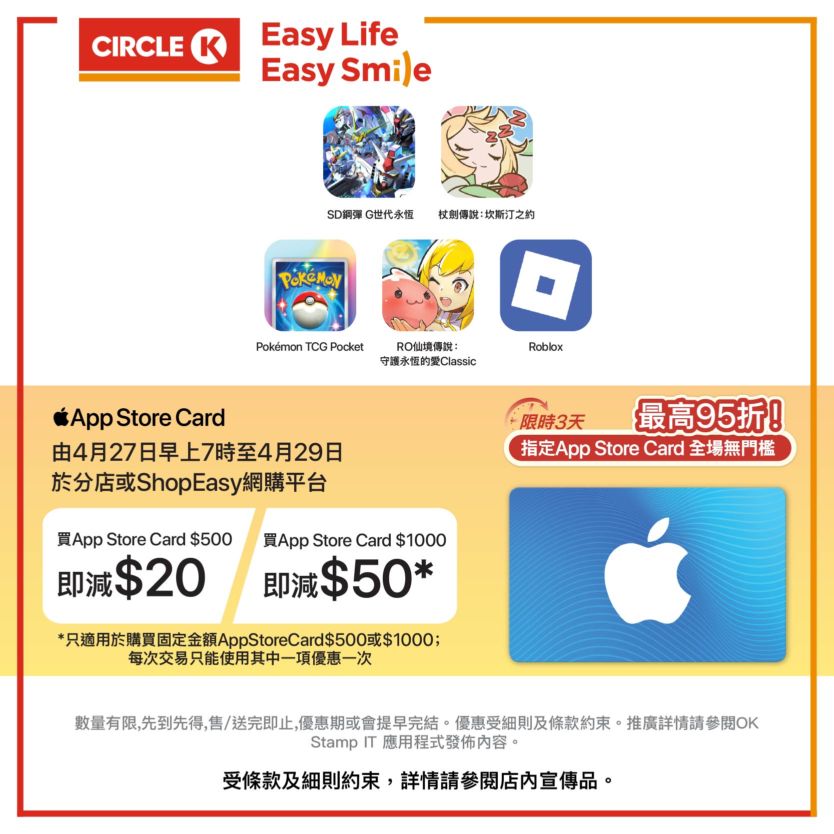 由 4 月 27 日早上 7 時至 4 月 29 日,只限 3 天!只要親臨 Circle K分店或上 ShopEasy 網購平台,購買指定面額 App Store Card,即享折扣優惠:
