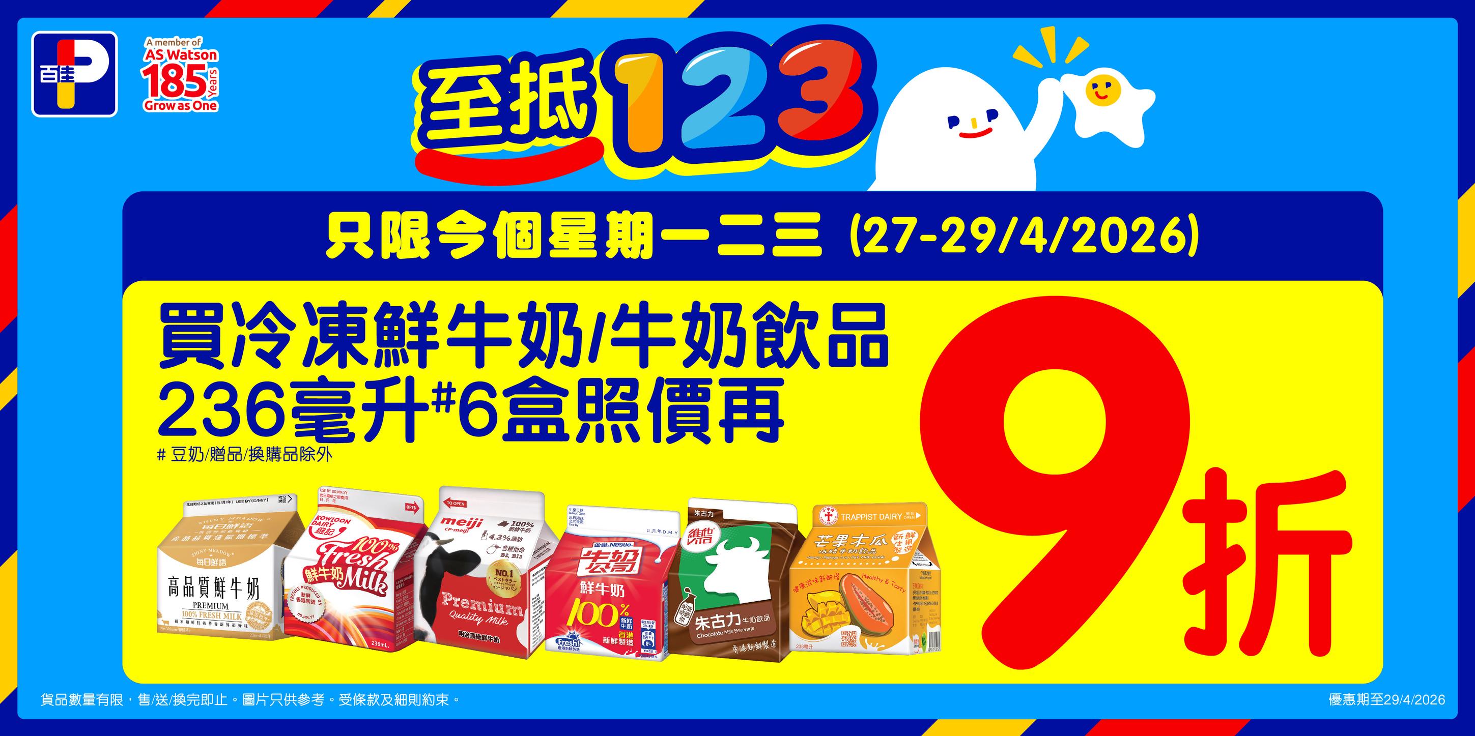*優惠期至29/4/2026。以上優惠適用於大部分香港百佳、FUSION、TASTE、INTERNATIONAL 及 PNS 網購有售,並不適用於百佳旗下的其他超市品牌、百佳快閃特賣埸。貨品數量有限,售/送/換完即止。圖片只供參考。受條款及細則約束。以每張發票計算。^豆奶除外。